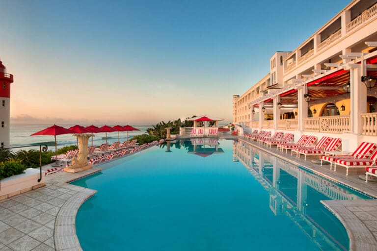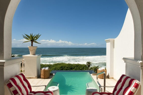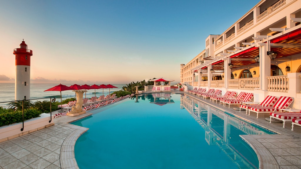 Standing proud on Umhlanga’s beachfront, directly on the beach and overlooking the Indian Ocean, the 86-room Oyster Box is one of South Africa’s best-loved hotels.