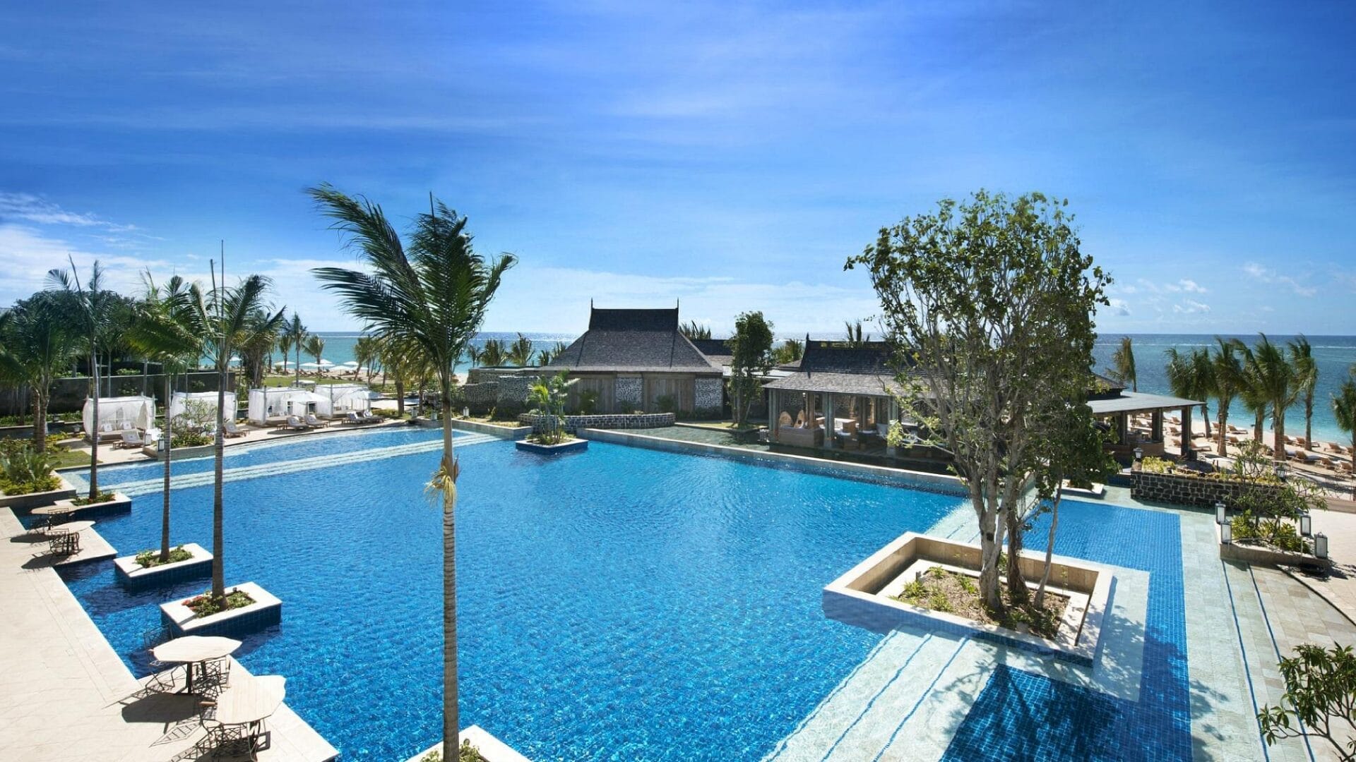 The 172 guest rooms and five-star St. Regis Mauritius Resort suites offer stunning views of the Indian Ocean.