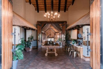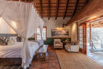 The lodge’s 20 air-conditioned, tastefully furnished Thatched Suites mix in with their surroundings and are scattered along walks bordered by lush landscaping and trees—accommodations with en-suite bathrooms and elegantly styled white bedding.