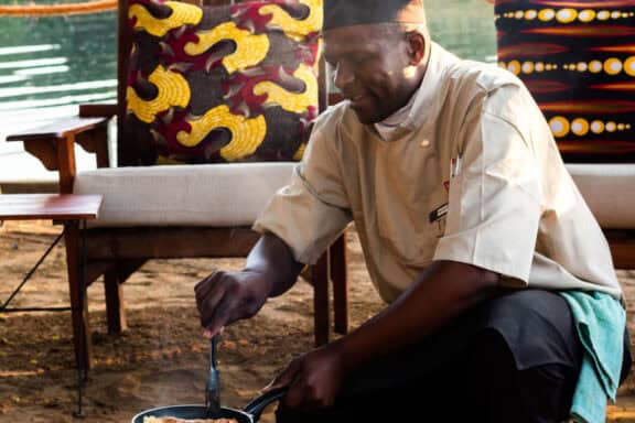 Despite the remote and tranquil setting, our culinary team uses locally produced ingredients to create delectable meals that satisfy the soul and delight the palette. Whether you dine under the stars, in the privacy of your suite, or overlooking the river, our attention to detail and warm hospitality will create a wonderful experience. At the end of a lively day on safari, enjoy your sundowner, a cherished African tradition. Whether you prefer a crisp gin and tonic or a local beer, our excellent bar staff have got you covered!