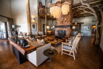Each bedroom boasts expansive bathrooms and secluded verandahs. The heart of the homestead is the generously sized lounge and dining space, accentuated with a striking dual-sided fireplace, flowing seamlessly onto a shaded veranda. You can refresh in the eco-friendly plunge pool or gather around the enchanting sundowner fire pit. You can also access the Gym, Photographic Studio, and the Gallery at the main camp Motse.