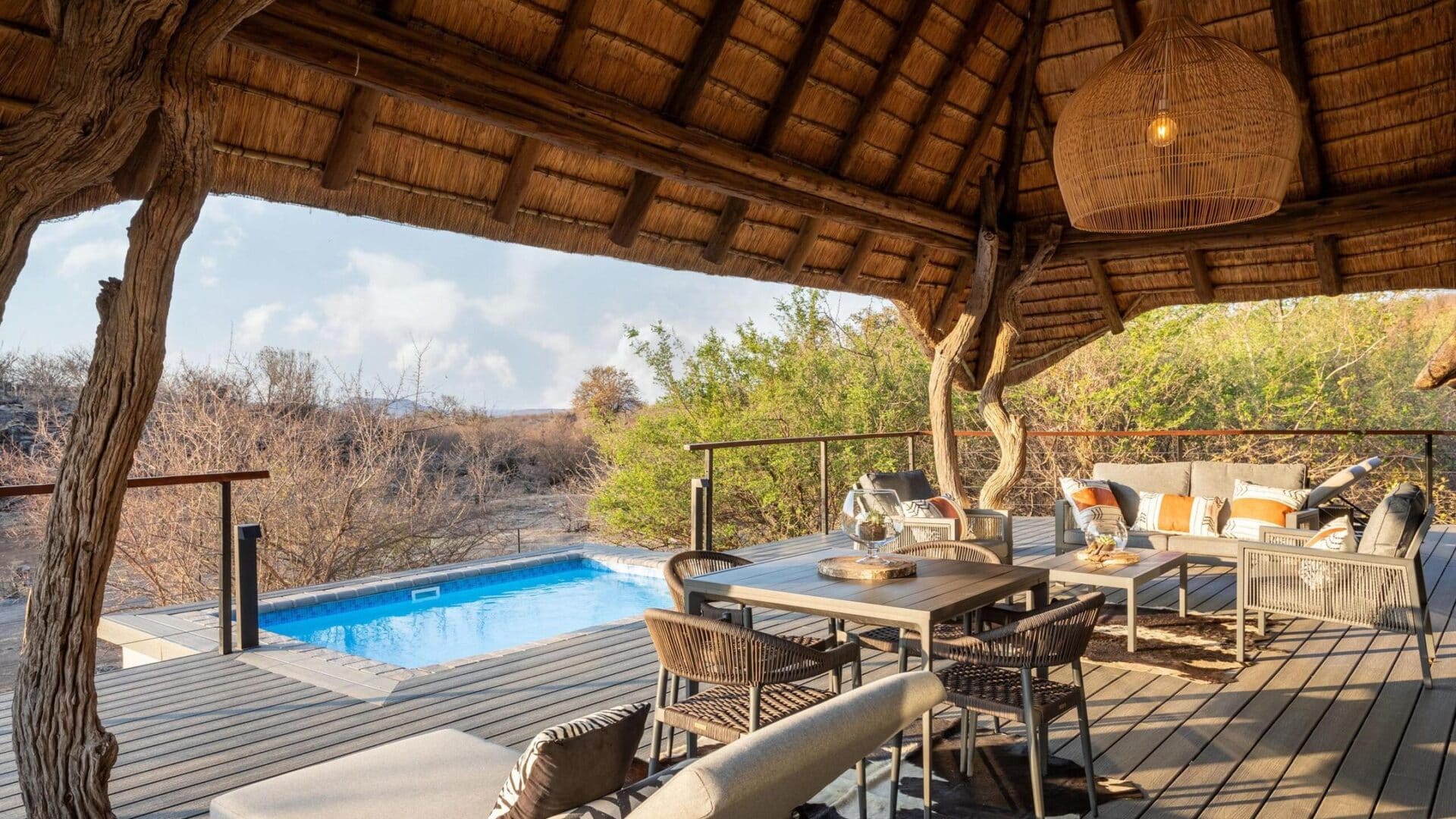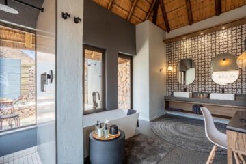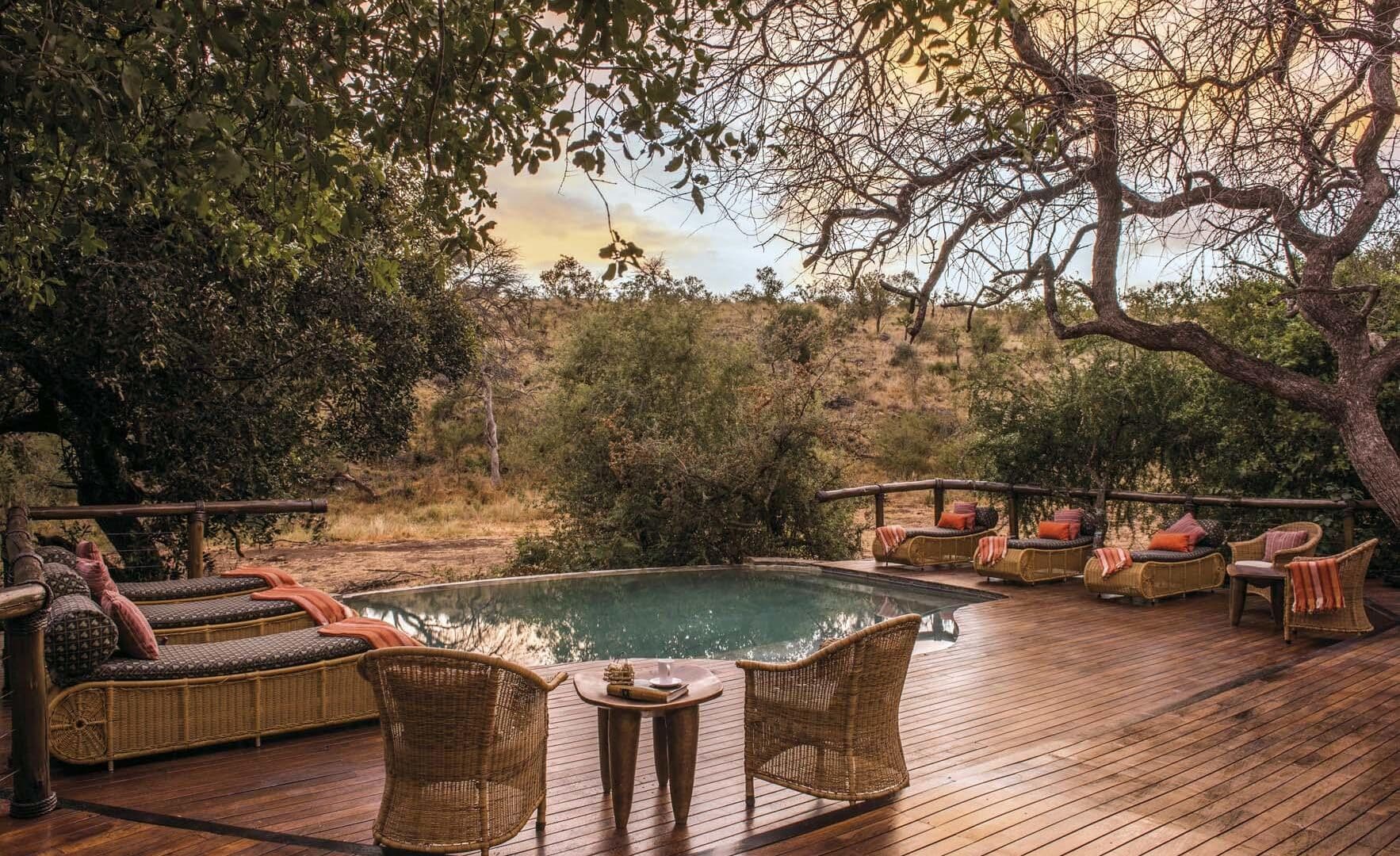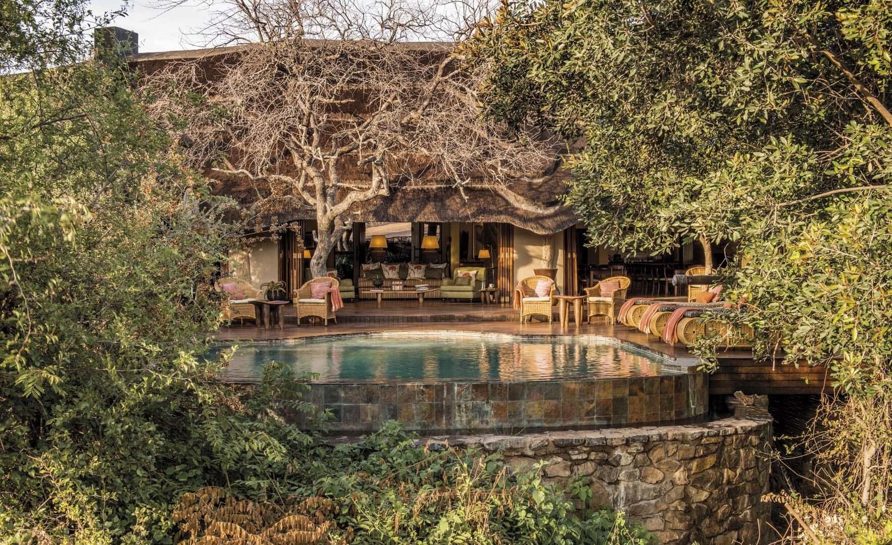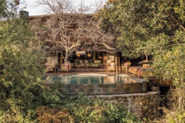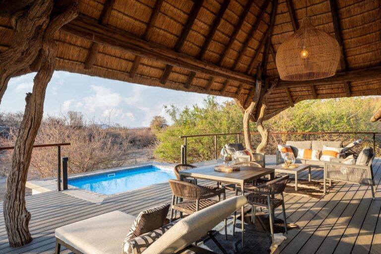 The main lodge, crowned with a traditional thatched roof, houses beautiful indoor and outdoor lounges, an elegant dining room, and a magnificent rim-flow pool overlooking an active waterhole. A sweeping wooden deck connects these areas to a boma situated beneath a 300-year-old Fig Tree, creating the perfect setting for al fresco dining under African skies.