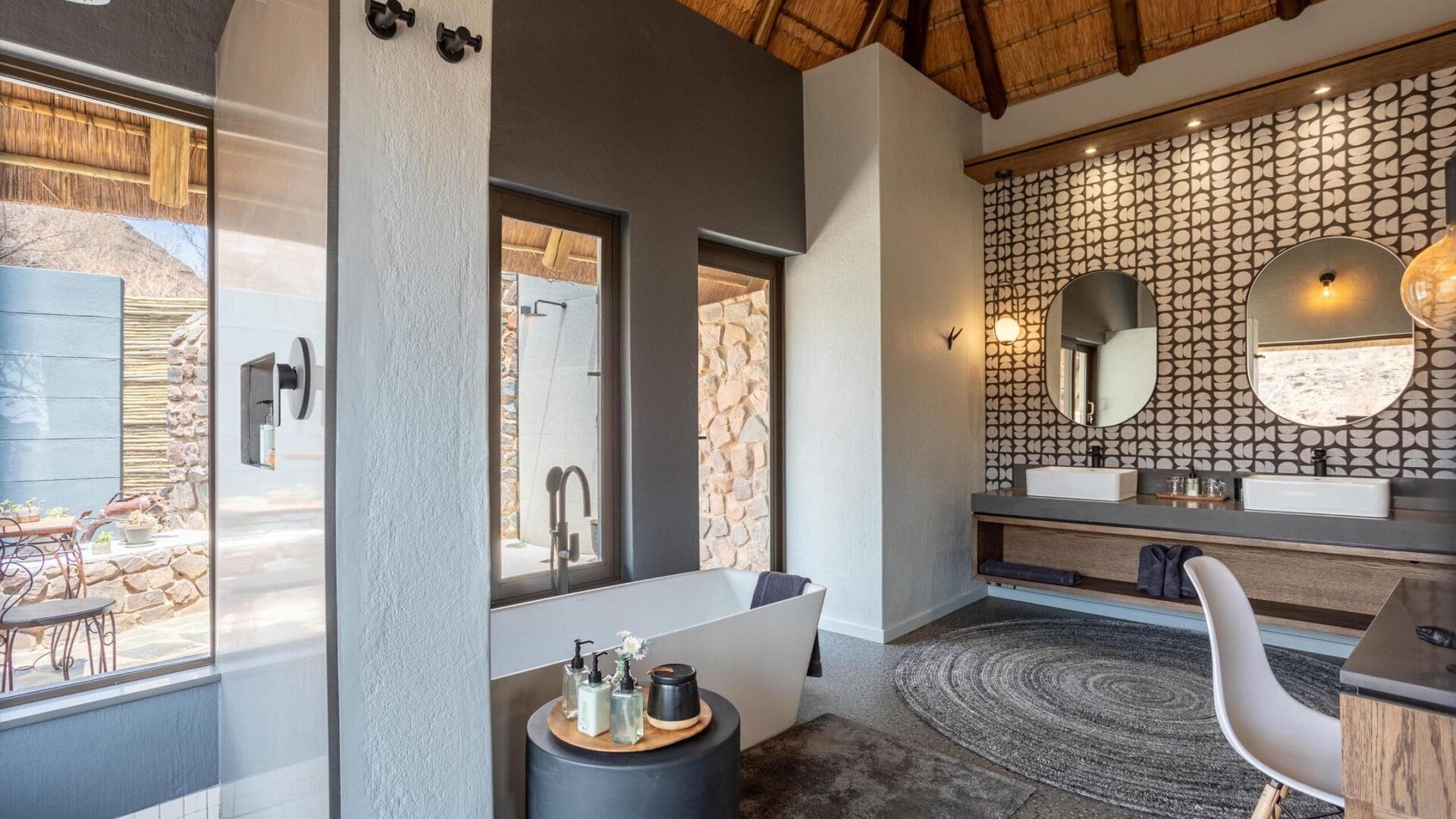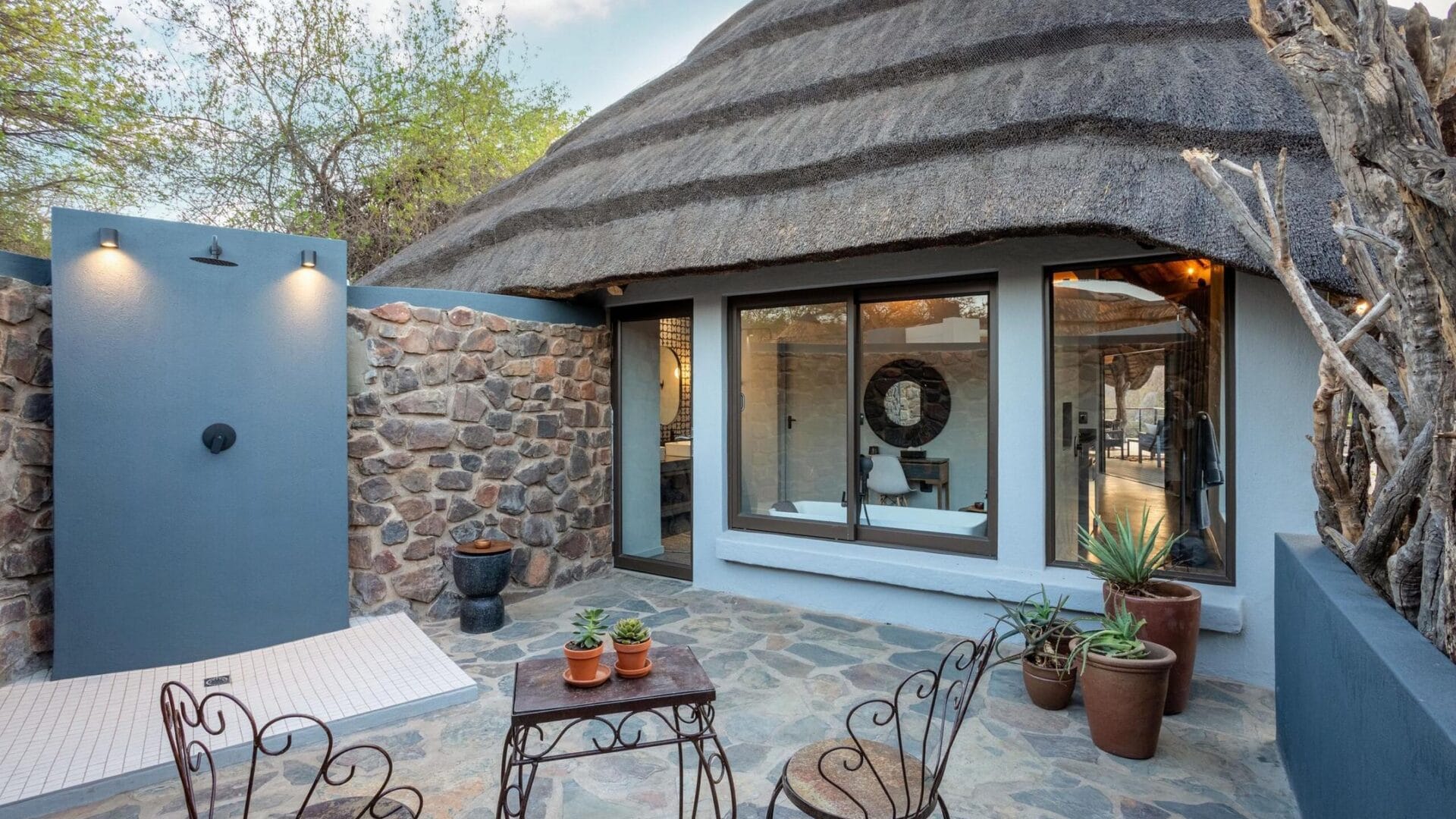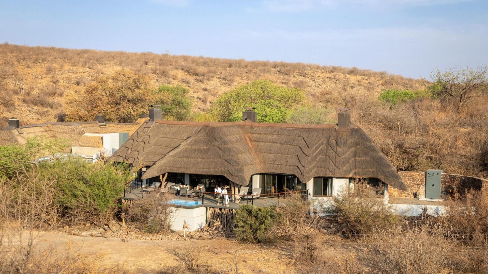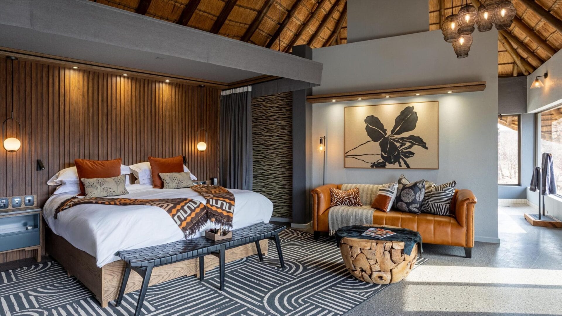 The main lodge, crowned with a traditional thatched roof, houses beautiful indoor and outdoor lounges, an elegant dining room, and a magnificent rim-flow pool overlooking an active waterhole. A sweeping wooden deck connects these areas to a boma situated beneath a 300-year-old Fig Tree, creating the perfect setting for al fresco dining under African skies.