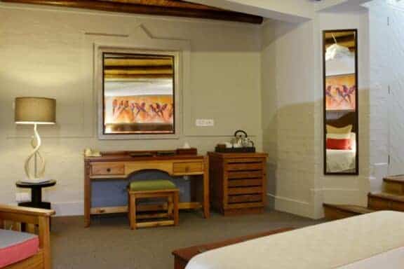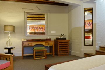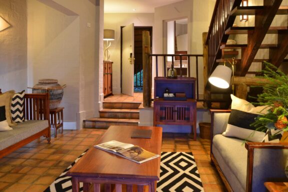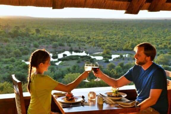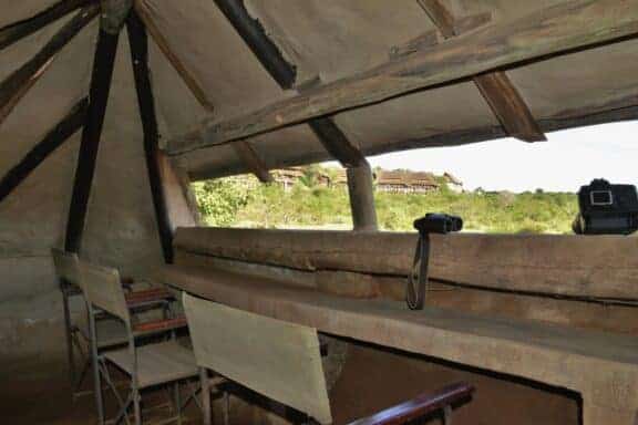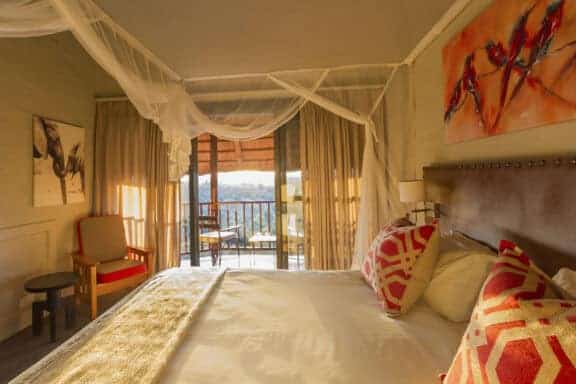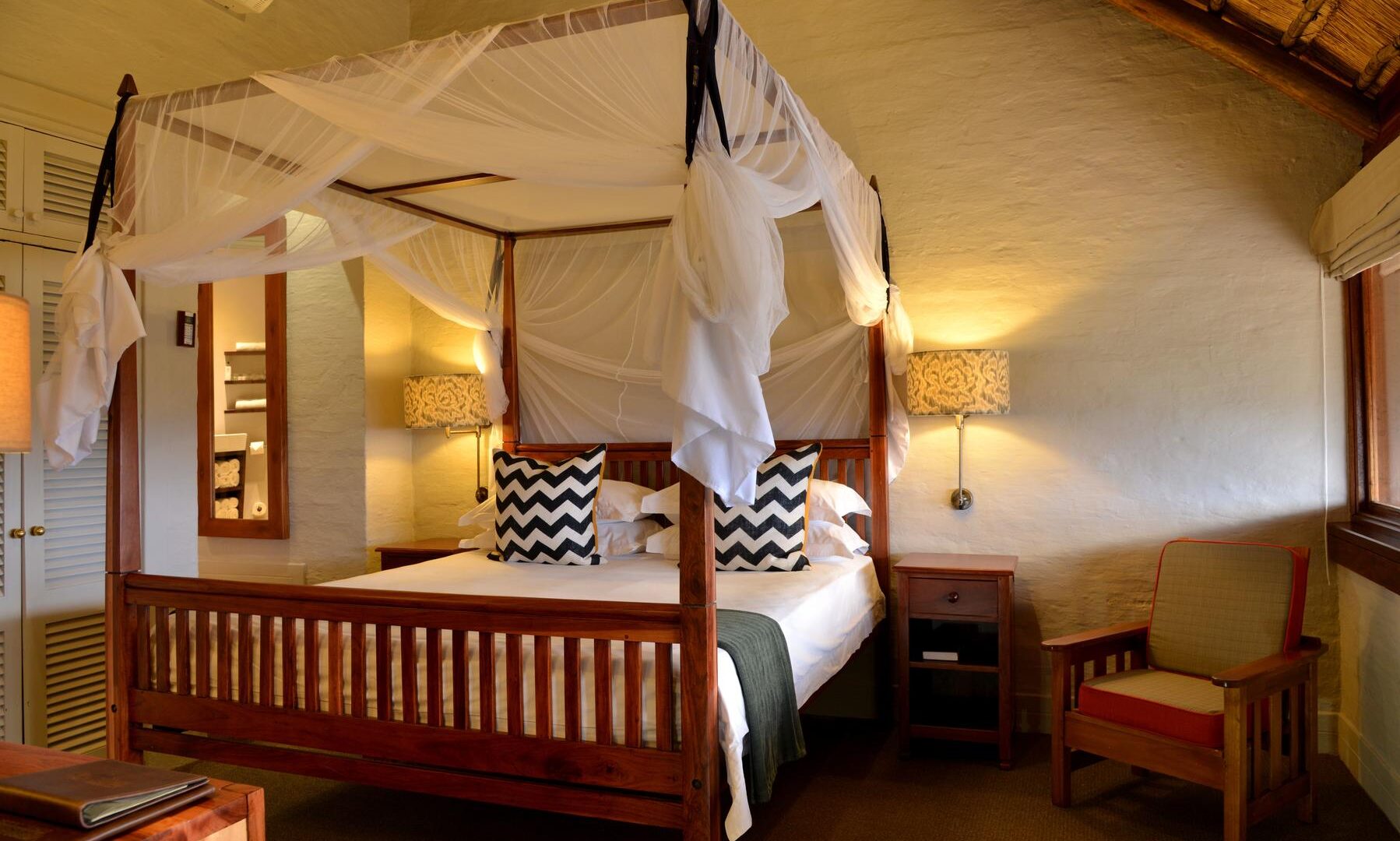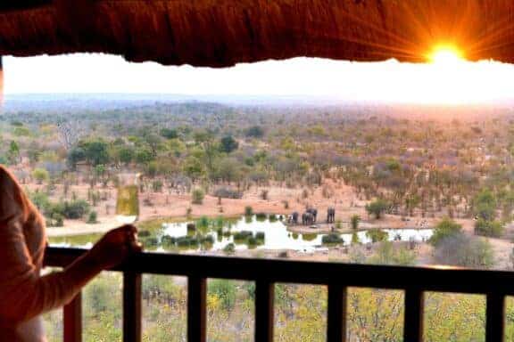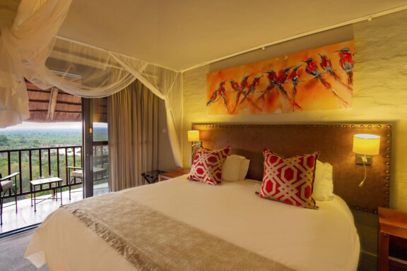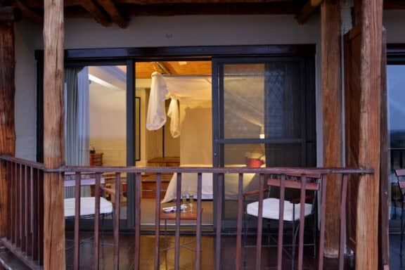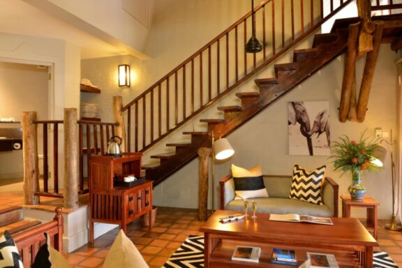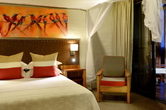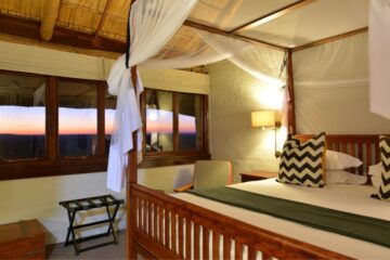 Built of thatch and timber, the lodge rises several levels, giving the impression of a vast open-plan tree house. Our rooms all have private balconies, most of which overlook a central waterhole, offering the opportunity to observe herds of buffalo, elephant and kudu, as the sun goes down, and hyenas later in the evening.