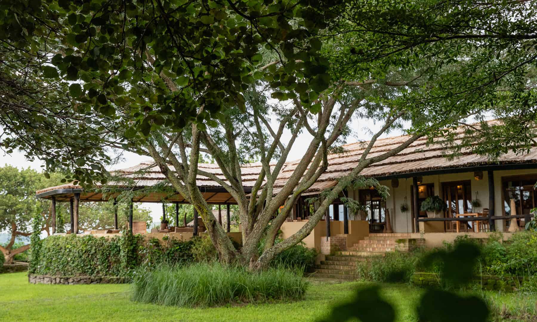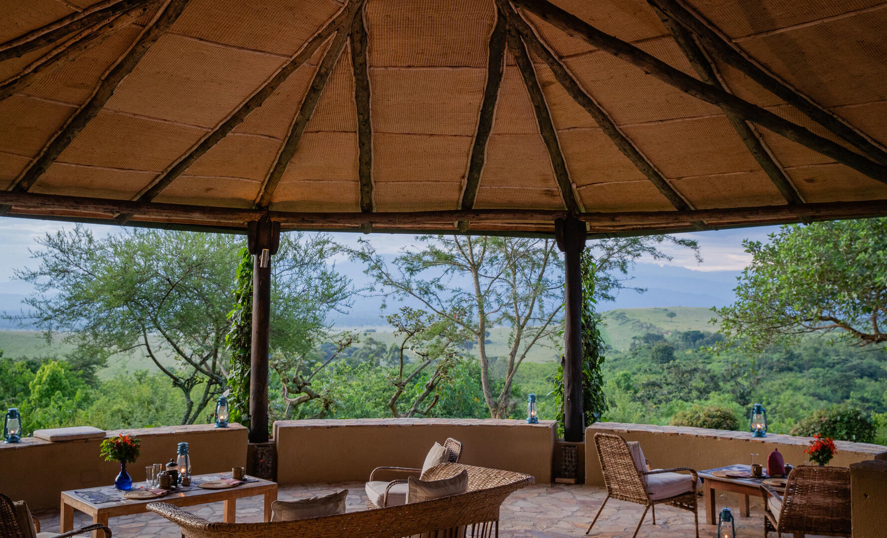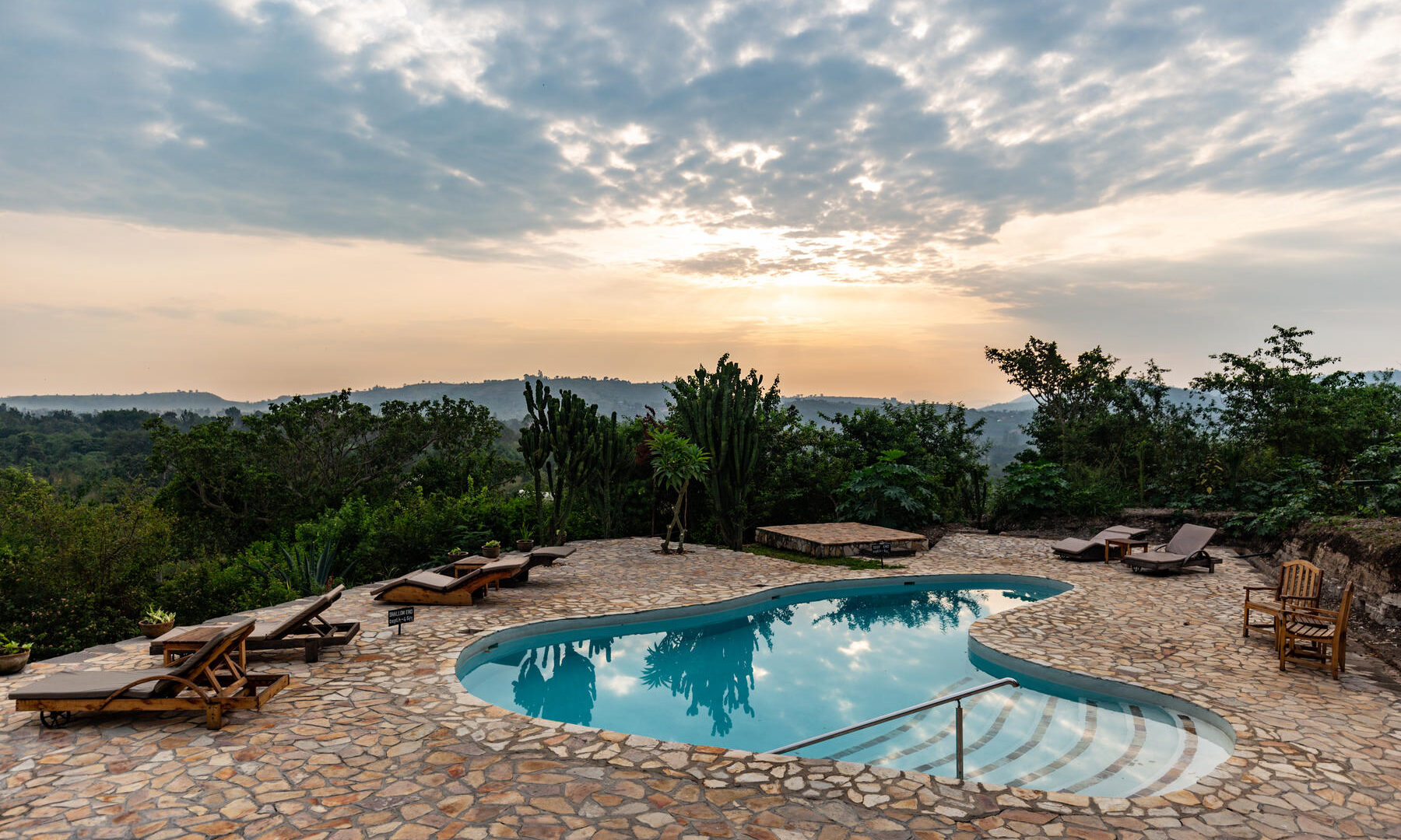 The lodge is located on the edge of Queen Elizabeth National Park with sweeping views of the rolling savanna, the distant mountains of the moon, and the sunken Kyambura Gorge.