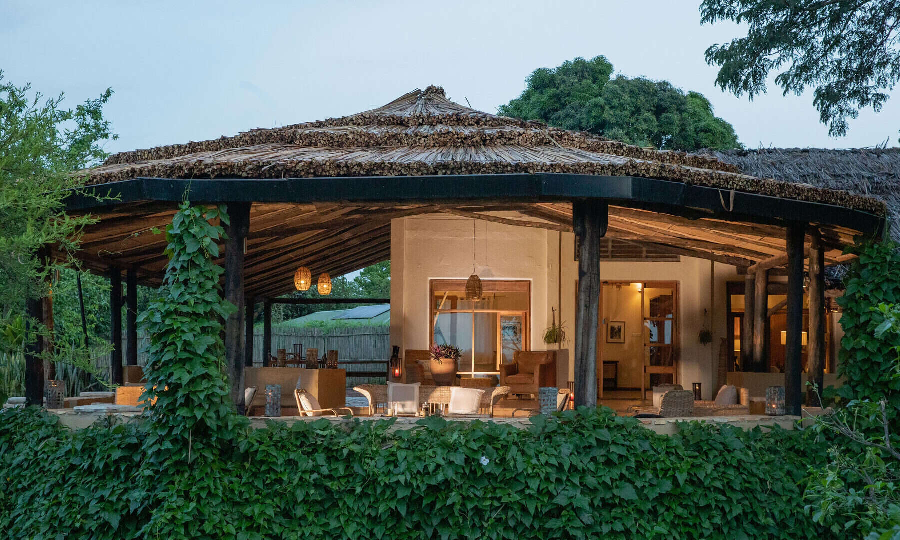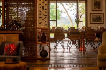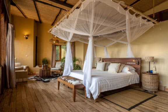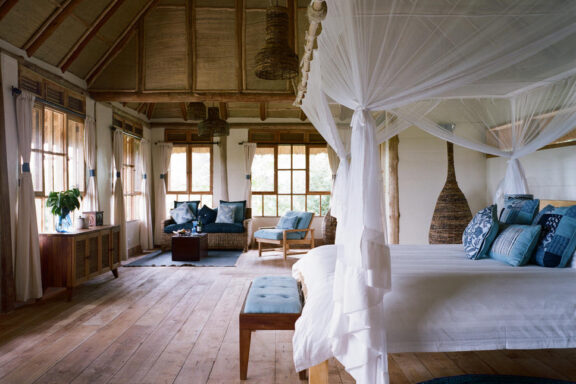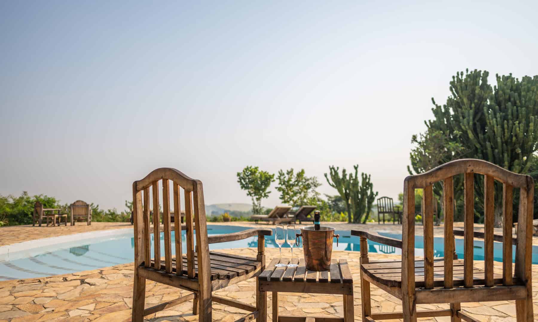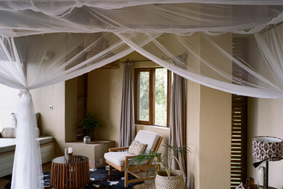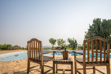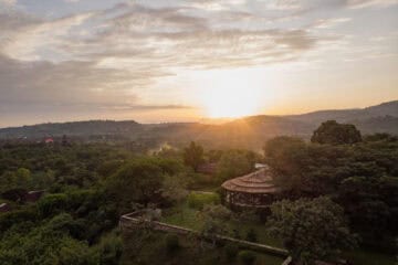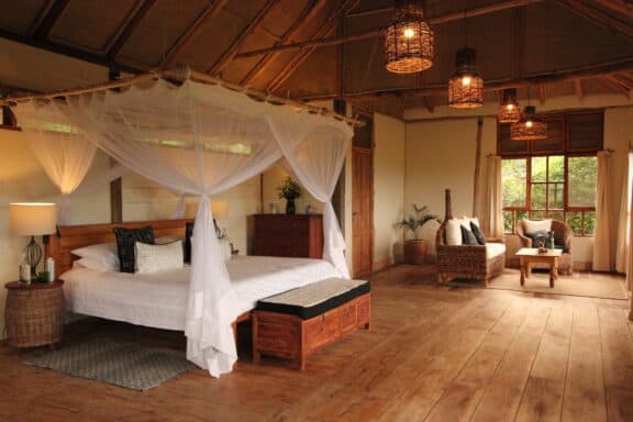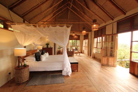 The lodge is located on the edge of Queen Elizabeth National Park with sweeping views of the rolling savanna, the distant mountains of the moon, and the sunken Kyambura Gorge.