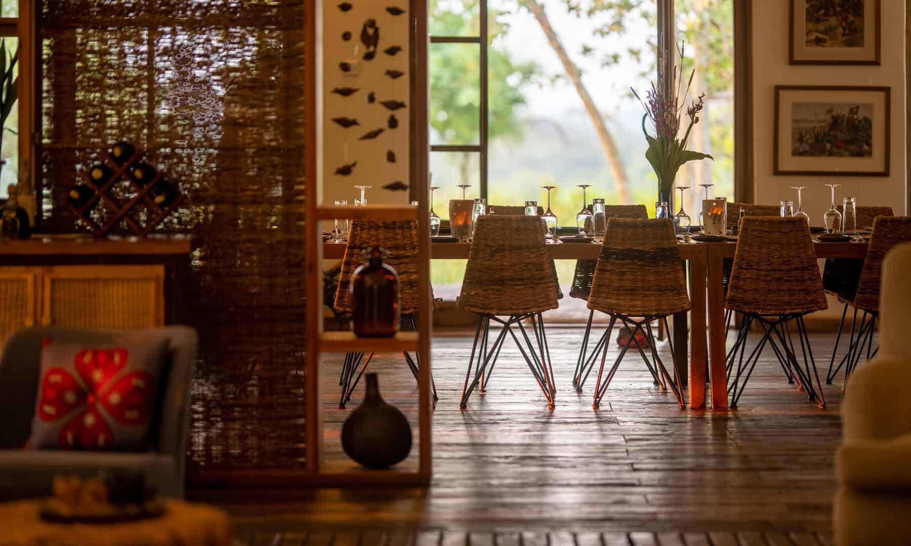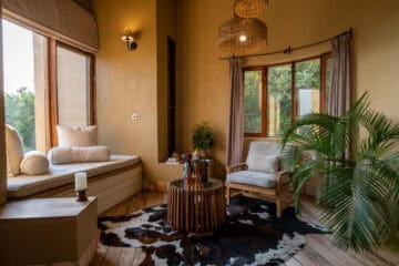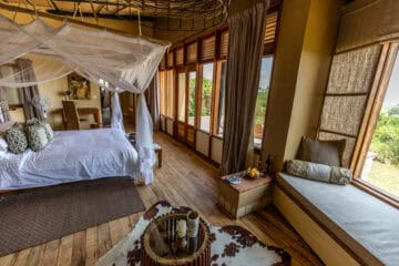 Each room/banda offers a unique view either across the savanna or the gorge. There is also a spa and a swimming pool on site.