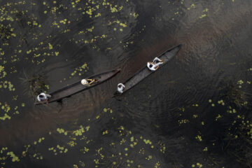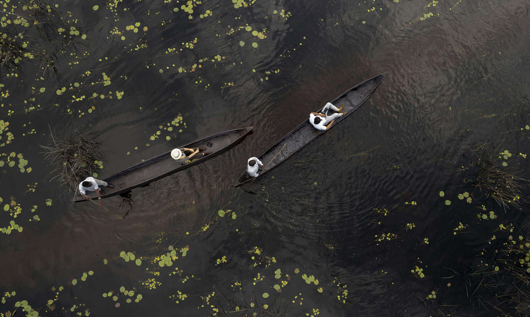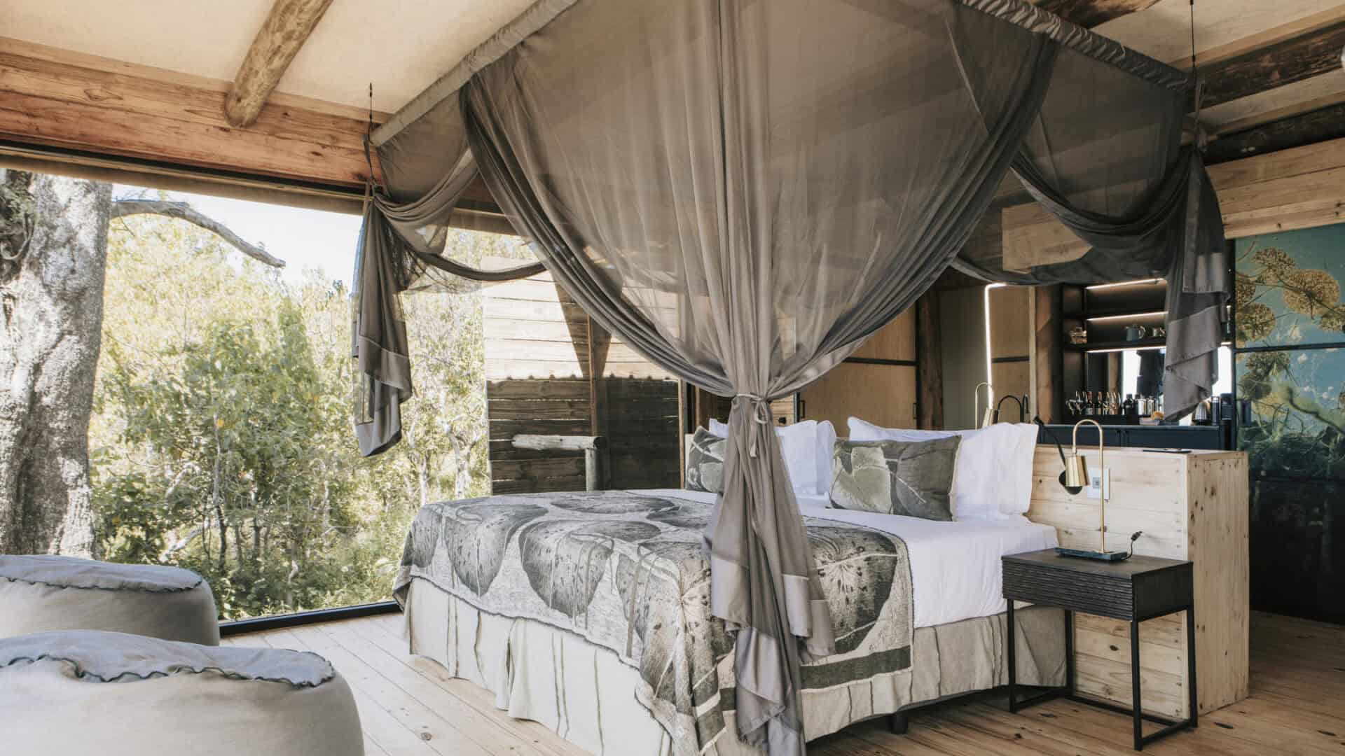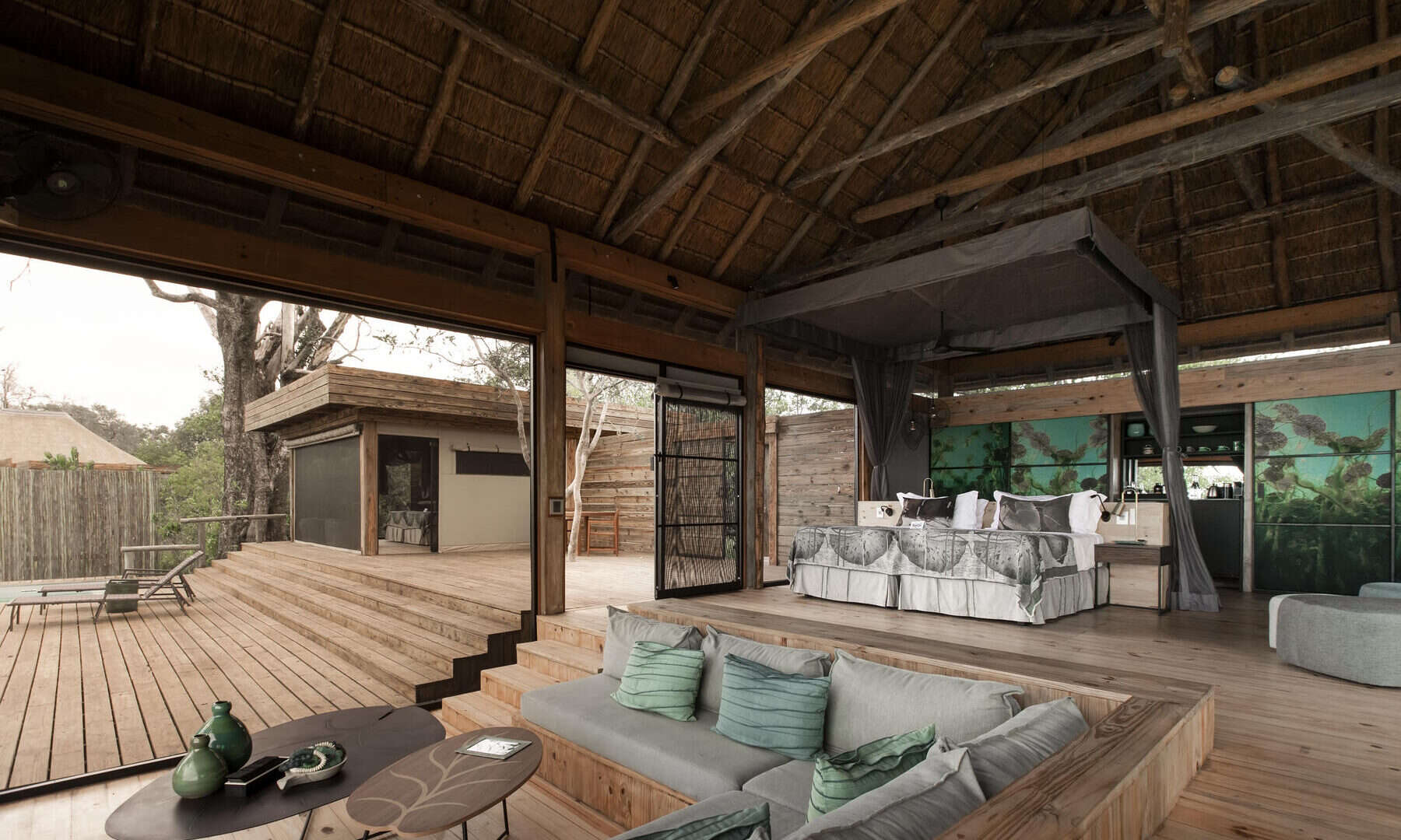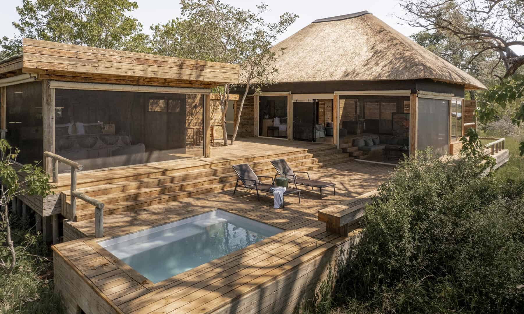 Fourteen light-filled suites are split between two satellite camps, each elevated on wooden decks to offer views across the floodplains. Every suite features floor-to-ceiling glass, a private plunge pool, and an outdoor sala, alongside indoor and outdoor showers. The shared areas offer a large lounge and dining space, as well as a fire pit for evening storytelling under the stars.