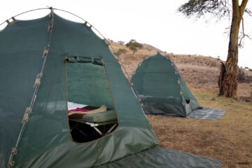 Each night, a new fly camp is set up in a different location, featuring netted dome tents with comfortable bedrolls and bucket showers.