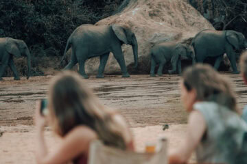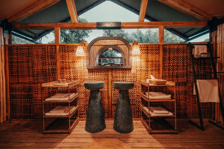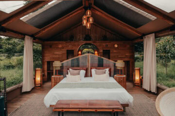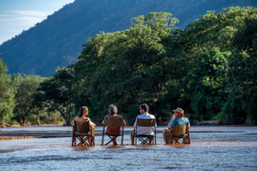 Set beneath the crashing cascades of the Endabash Waterfall, this breathtaking camp sits on the edge of a dry river bed.