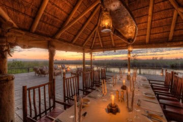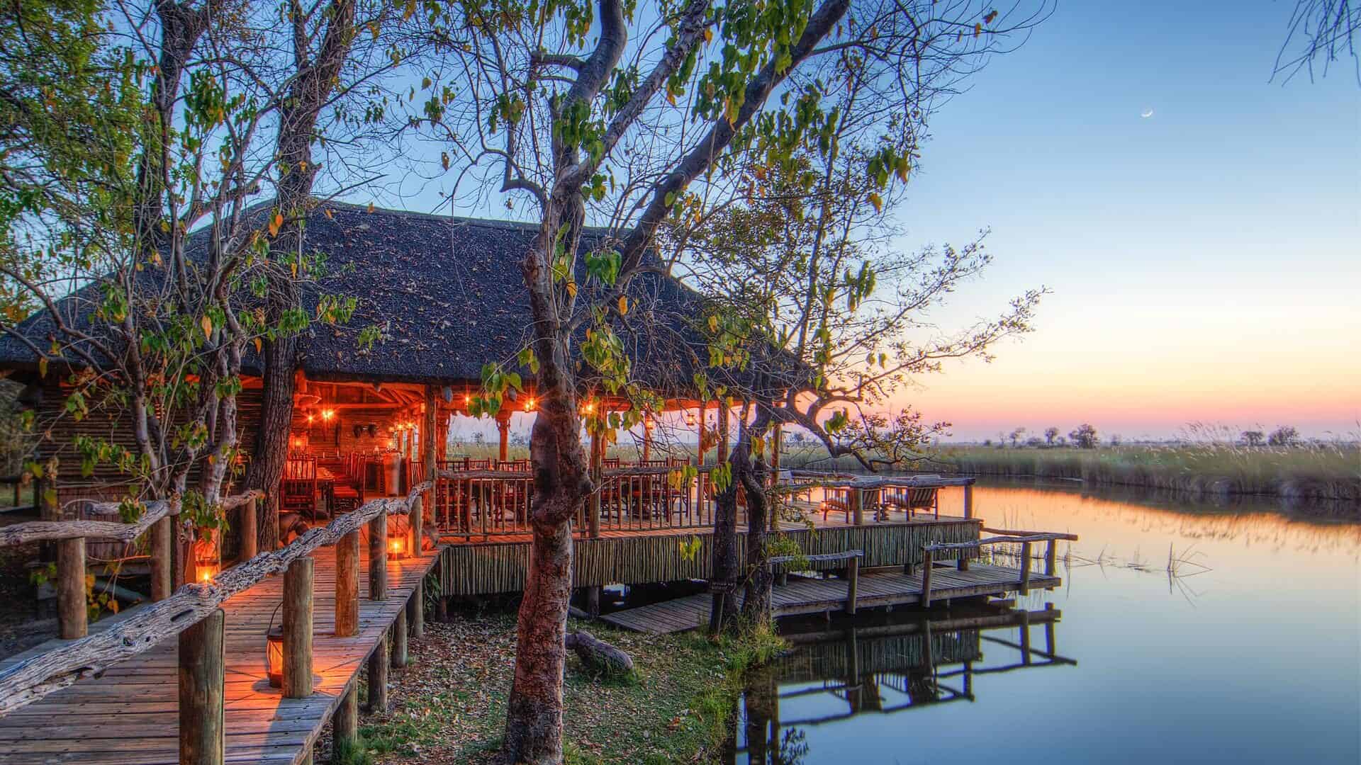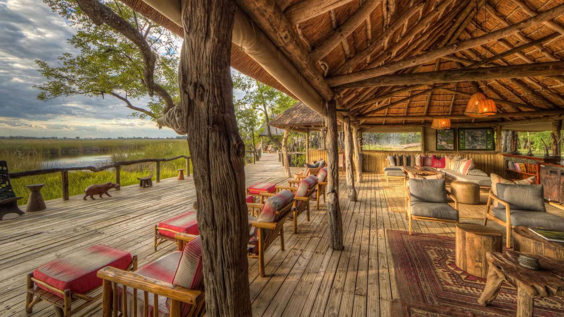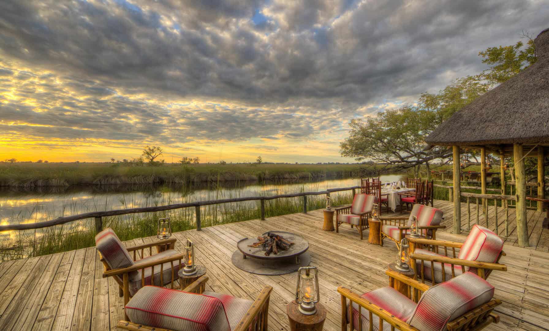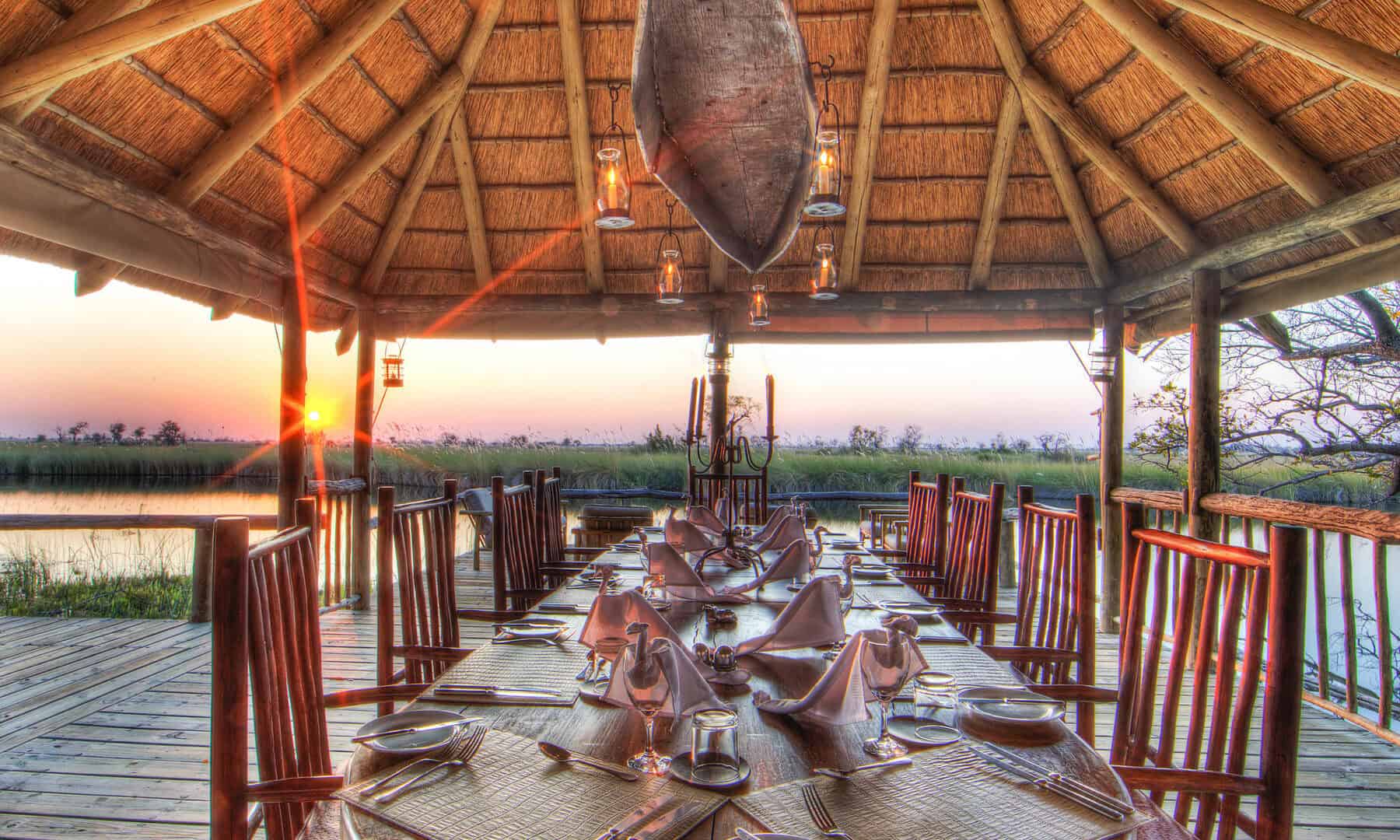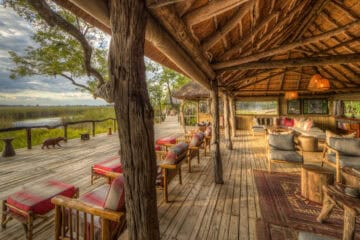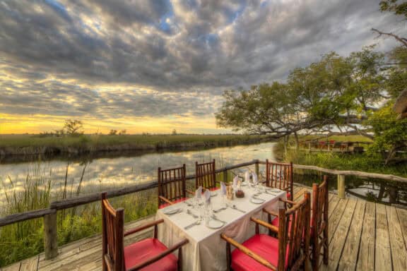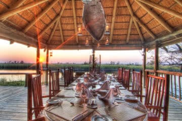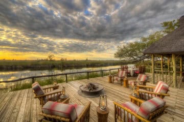Camp Xakanaxa is located on the banks of the Khwai River on the Xakanaxa Lagoon, in the heart of the Moremi Game Reserve. It offers guests an authentic, year round Okavango Delta land and water safari experience. The camp accommodates twenty four guests in twelve spacious all canvas, classic Meru style luxury safari tents, with en suite showers and hand basins. Situated around the fringe of the lagoon, every tent has a private viewing deck with comfortable loungers. The stylish main buildings extend over the Khwai River and are set on raised platforms to maximize the views over the surrounding lagoons and islands. The elegant lounge and dining rooms, built of local timber, reed and thatch, feature a small library, expansive sundeck, plunge pool and sala with day bed.