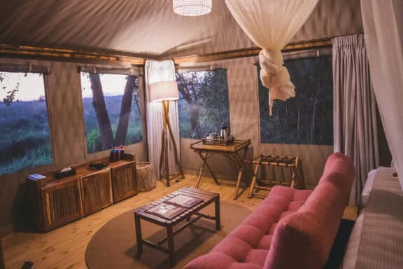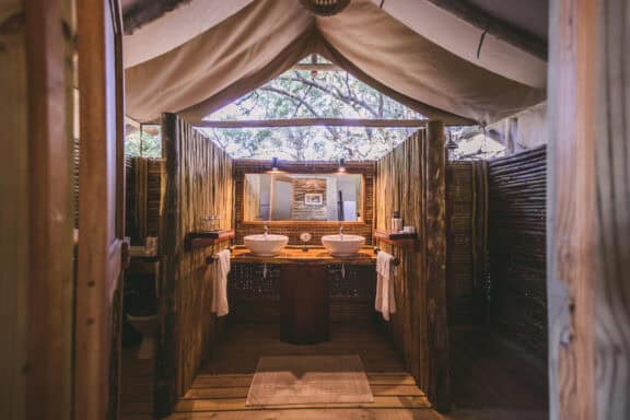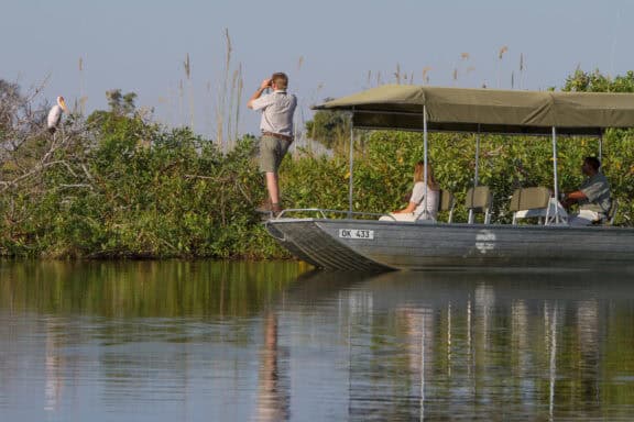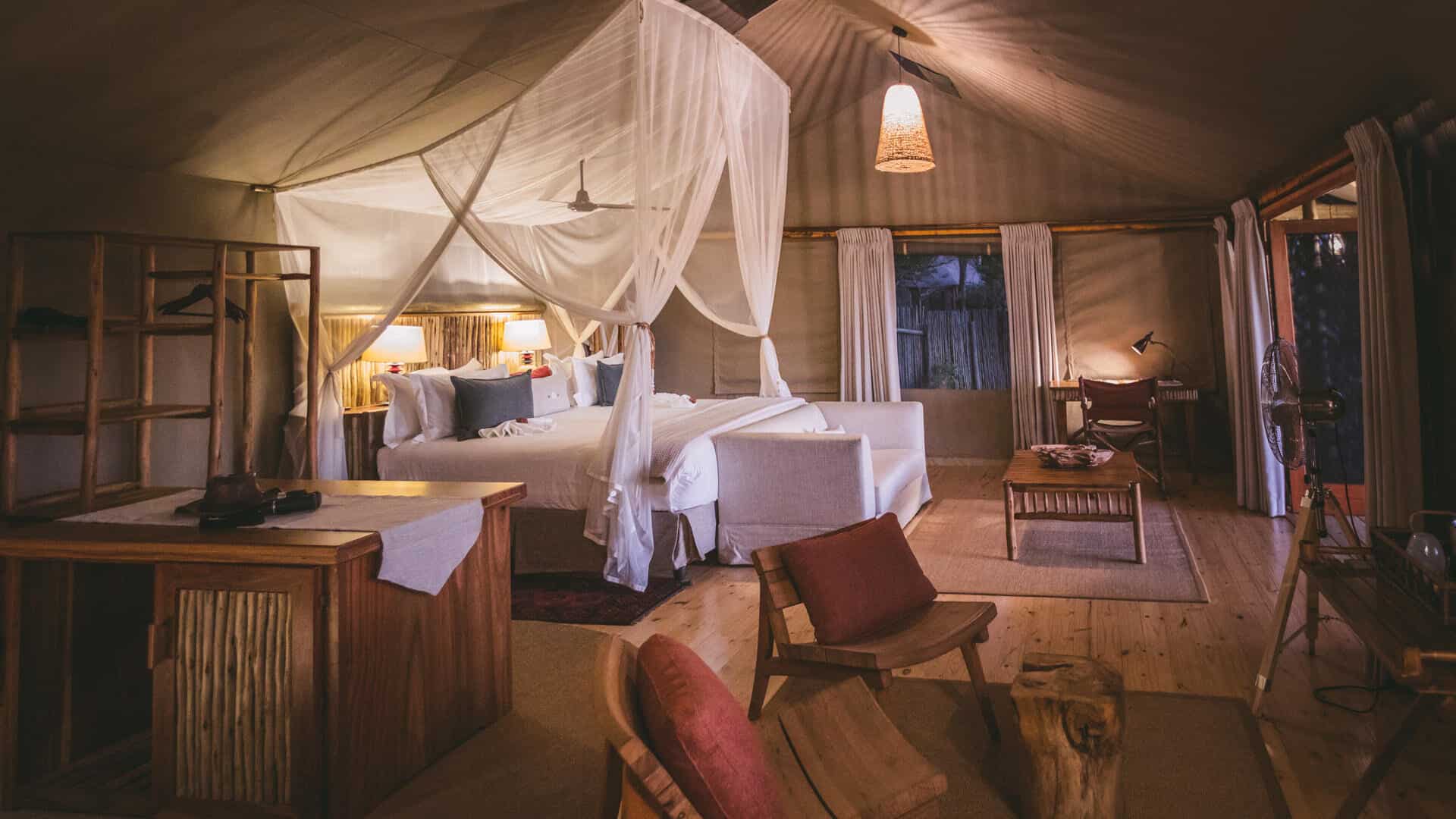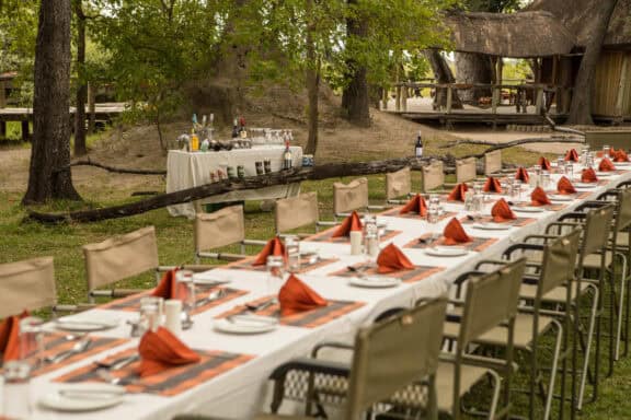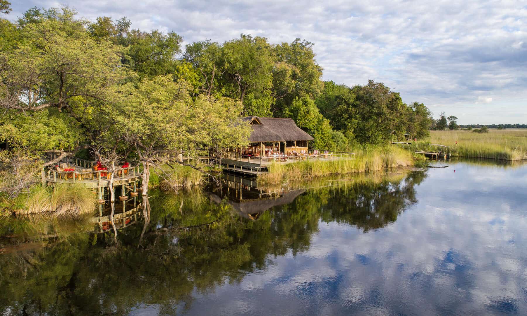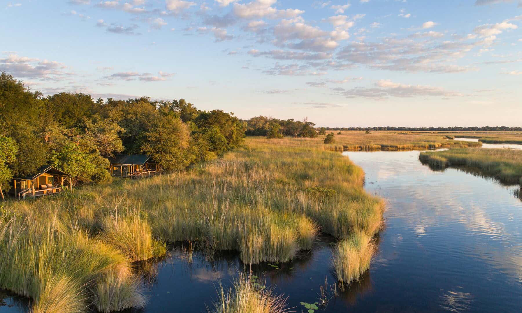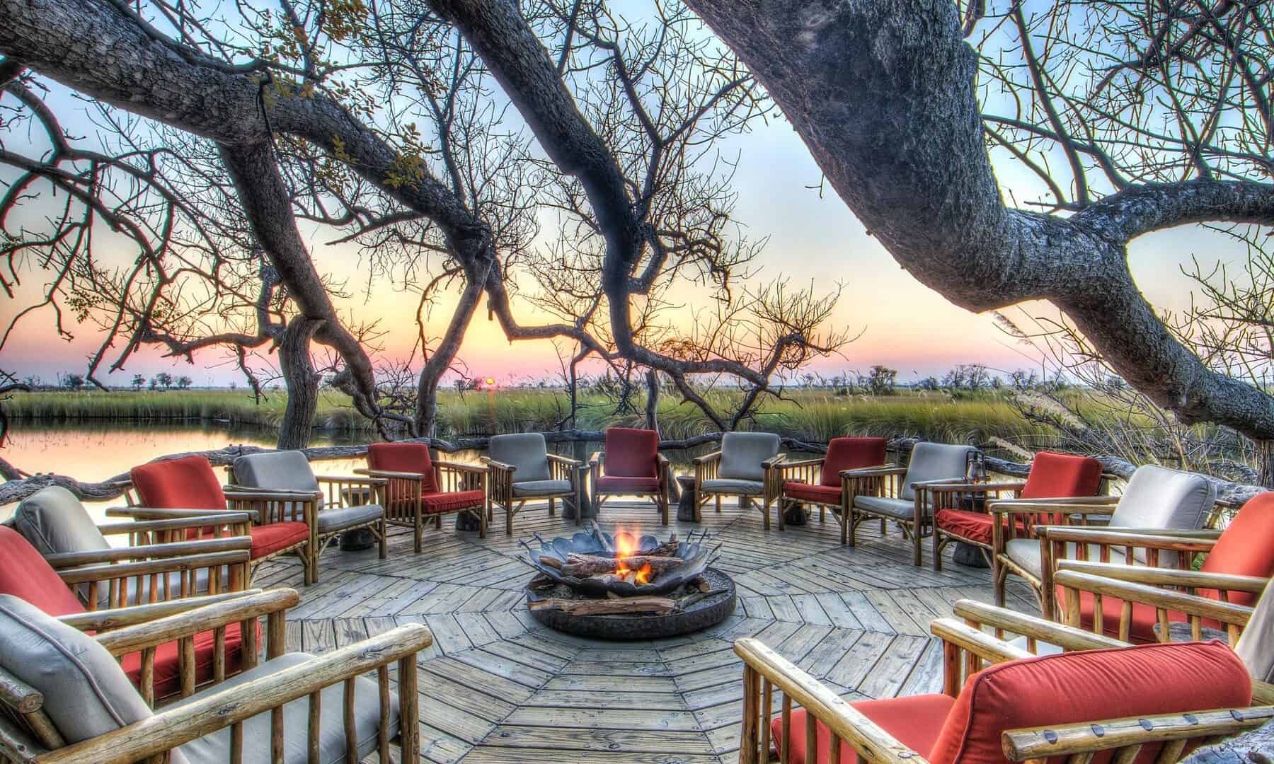 Camp Xakanaxa is located on the banks of the Khwai River on the Xakanaxa Lagoon, in the heart of the Moremi Game Reserve. It offers guests an authentic, year round Okavango Delta land and water safari experience. The camp accommodates twenty four guests in twelve spacious all canvas, classic Meru style luxury safari tents, with en suite showers and hand basins. Situated around the fringe of the lagoon, every tent has a private viewing deck with comfortable loungers. The stylish main buildings extend over the Khwai River and are set on raised platforms to maximize the views over the surrounding lagoons and islands. The elegant lounge and dining rooms, built of local timber, reed and thatch, feature a small library, expansive sundeck, plunge pool and sala with day bed.