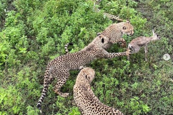 Mom cheetah teaching her three cubs some hunting kills