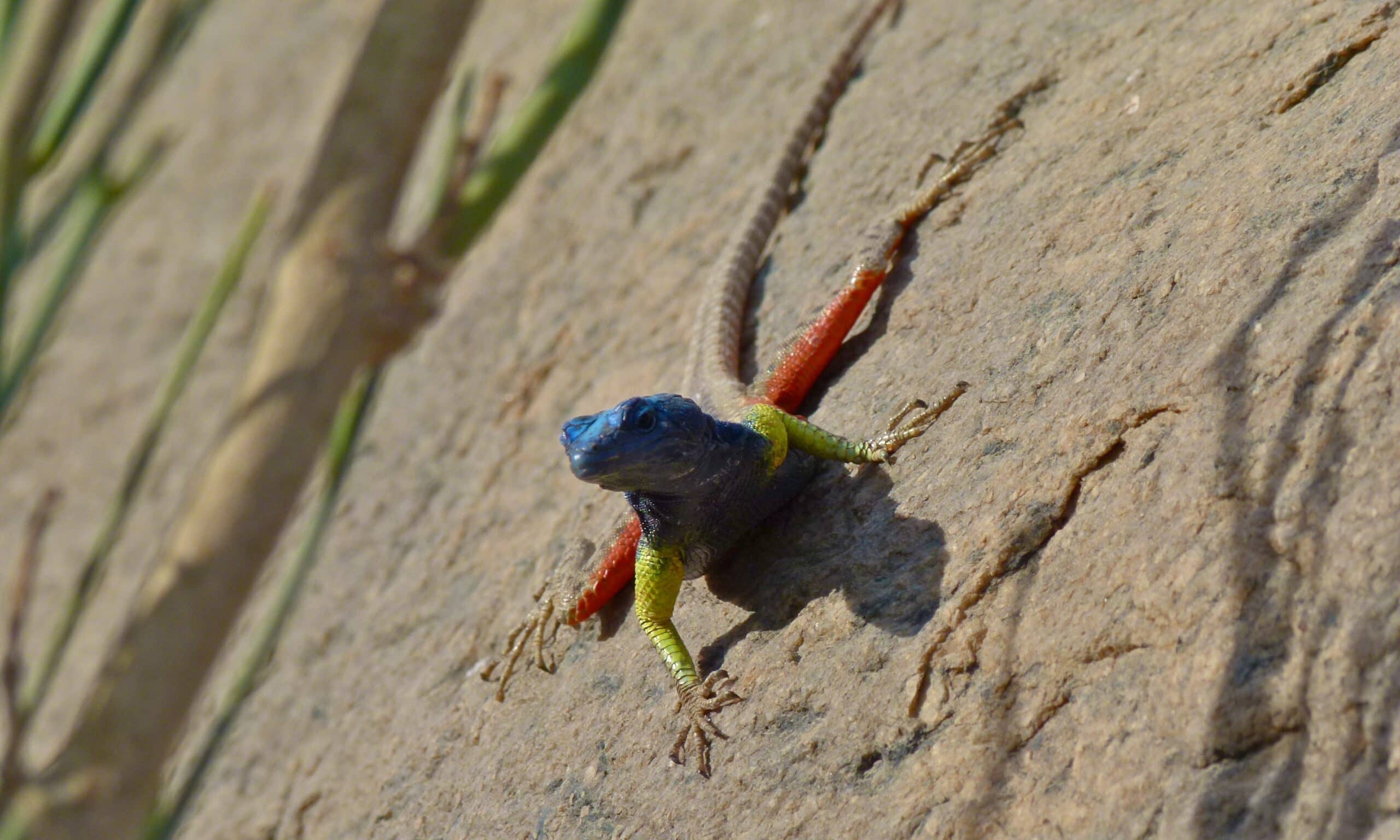 These little reptiles grow to a maximum length of around 8 cm, and while females have colouration that blends into the dusty landscape, males are a combination of bright blue, yellow, orange, and tan. Unfortunately for the males, while this definitely gets the females’ attention, it also marks them as easy targets for predators like rock kestrels.