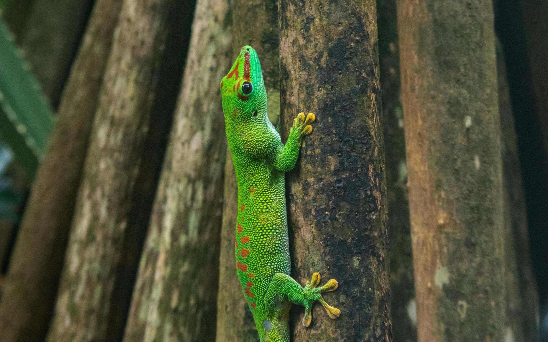 Being day geckos, they’re active mainly during daylight hours, hunting small invertebrates and lapping up sweet fruit, nectar, and pollen. Their bright colouration makes them stand out when they’re perched on tree trunks, but once they dash into the foliage, it’s virtually impossible to spot them.