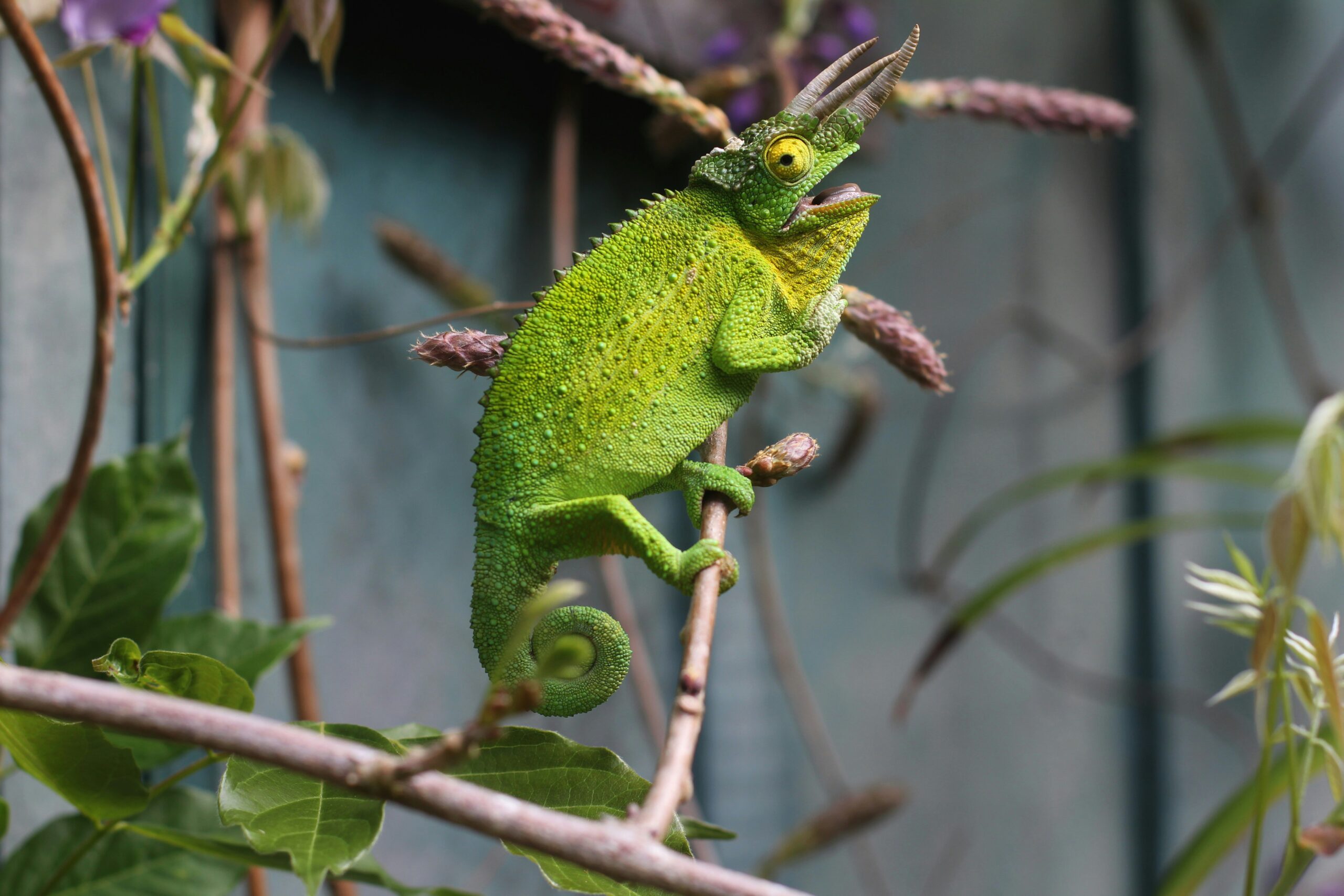In the case of Jackson’s chameleon, also known as the three-horned chameleon, its tongue is around one and a half to two times its bodylength. This large chameleon gets its name from its Triceratops-like horns that protrude from its face, giving it a particularly aggressive appearance. Only males have three horns, but surprisingly, they almost never use them for fighting. Instead, they fight for dominance using colour displays and aggressive posturing.