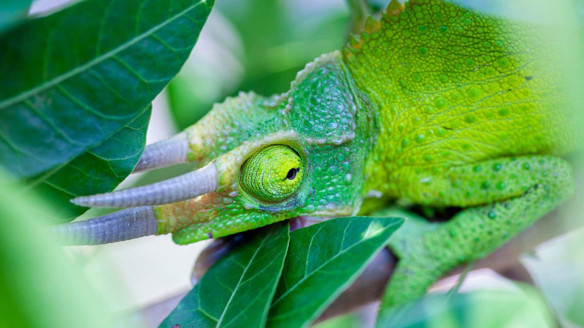 In the case of Jackson’s chameleon, also known as the three-horned chameleon, its tongue is around one and a half to two times its bodylength. This large chameleon gets its name from its Triceratops-like horns that protrude from its face, giving it a particularly aggressive appearance. Only males have three horns, but surprisingly, they almost never use them for fighting. Instead, they fight for dominance using colour displays and aggressive posturing.