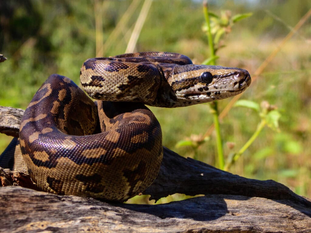 At 10-15 ft long, the African rock python is the largest snake in Africa. Like all pythons, this snake is non-venomous. Instead, it kills by constriction, ambushing and coiling around its prey, tightening its coils every time its victim breathes out. This eventually leads to death by cardiac arrest. African rock pythons feed on everything from birds to bats and medium-sized mammals. A larger python can capture warthogs, bushbucks, and even crocodiles. African rock pythons are often found near human settlements due to the presence of rodents and other vermin. They are excellent swimmers and can hold their breath for a long time. Places you’ll find the African rock python include, but are not limited to: