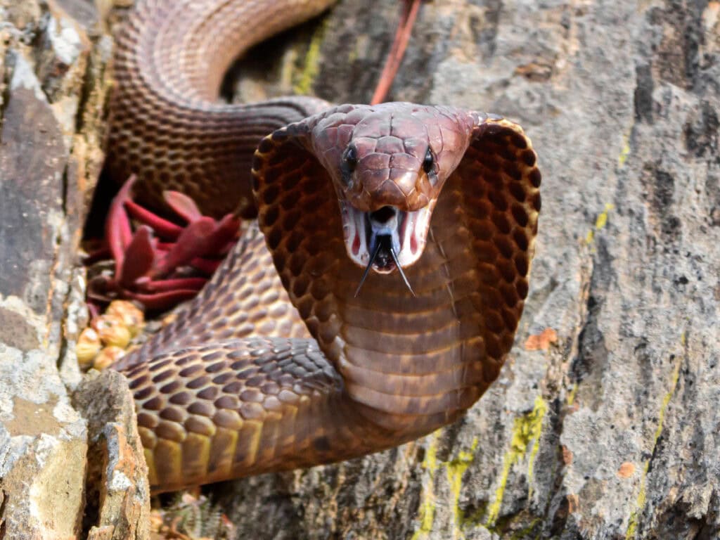 The Cape Cobra is one of four non-spitting cobras found in southern Africa. When disturbed, it will raise its head and extend its ribs to form a broad hood, accompanied by a loud hissing sound. Cape cobras have fixed front fangs which they use to bite their prey and inject a very powerful and fast acting neurotoxic venom, which can lead to paralysis and death. The Cape cobra is diurnal and actively hunts during the day. Its prey includes rodents, birds, frogs, lizards, and other snakes. Although found mostly on the ground, it’s able to climb into trees and shrubs to search for food or when confronted. Places you’ll find the Cape cobra include, but are not limited to: