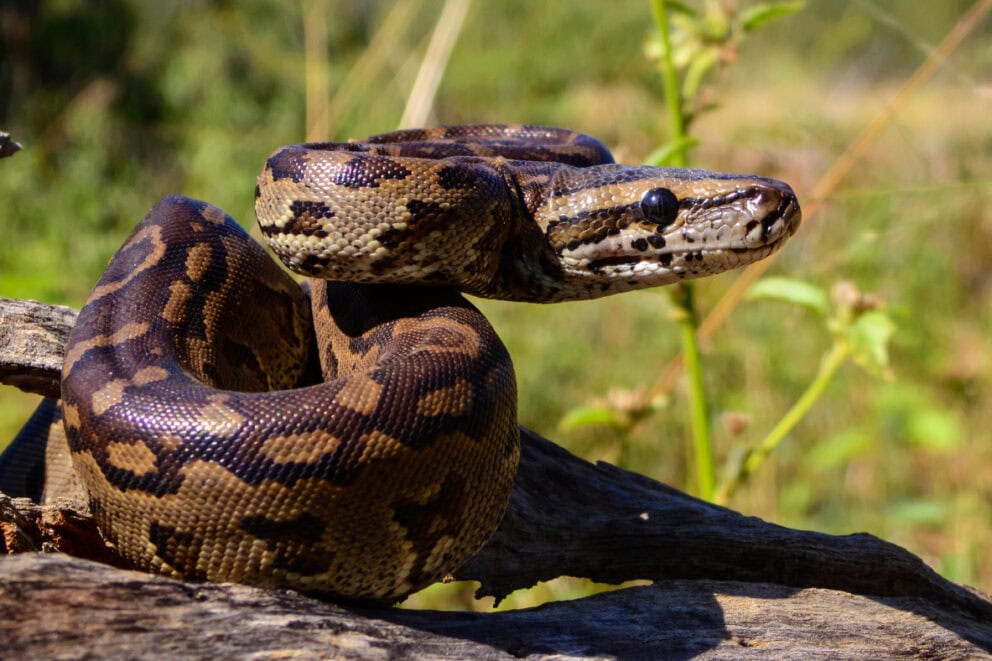 At 10-15 ft long, the African rock python is the largest snake in Africa. Like all pythons, this snake is non-venomous. Instead, it kills by constriction, ambushing and coiling around its prey, tightening its coils every time its victim breathes out. This eventually leads to death by cardiac arrest. African rock pythons feed on everything from birds to bats and medium-sized mammals. A larger python can capture warthogs, bushbucks, and even crocodiles. African rock pythons are often found near human settlements due to the presence of rodents and other vermin. They are excellent swimmers and can hold their breath for a long time. Places you’ll find the African rock python include, but are not limited to: