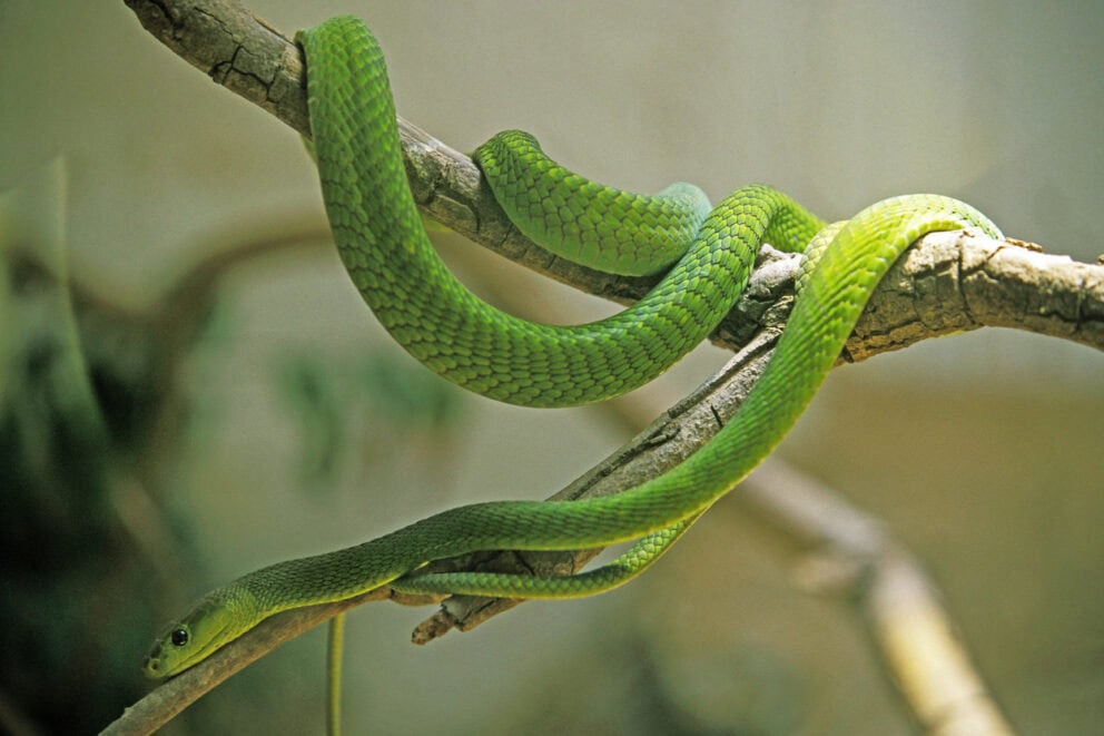 This snake prefers coastal areas with dense, shaded vegetation. It can be found living in trees in lowland tropical rainforests, coastal bushlands, and montane forests. These bright green mambas are opportunistic hunters and spend their days either stationary while waiting for prey to wander within their reach, or actively hunting small prey in the trees, such as birds and their eggs, lizards, and bats. These snakes are beautiful but highly venomous, with a neurotoxic venom that can lead to respiratory paralysis and death in as little as 30 minutes. Places you’ll find the East African green mamba include, but are not limited to: