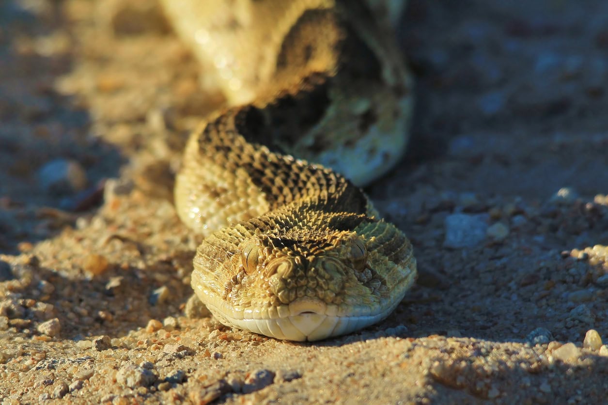 The puff adder is a very thick, medium-sized snake, measuring an average of about three feet long. Its subdued colors of tan, brown, gold, and even gray help it blend in with its environment. The puff adder gets its name from its ability to puff itself up when threatened. As a member of the viper family, it is defined by long, hinged fangs that penetrate deep into the skin and inject a highly toxic venom. Because of their wide distribution and tendency to bask on footpaths, they’re thought to be responsible for the most snakebite fatalities in Africa. Places you’ll find the puff adder include, but are not limited to: