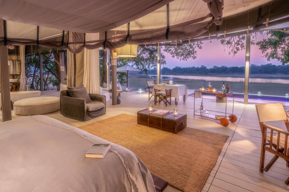 Along the Luangwa River lies Time + Tide Chinzombo, one of the luxurious accommodations of this trip. Modernity meets traditional safari bush camp; here, you can sink into a tub and enjoy panoramic views of the wilderness, including hippos bobbing in the water and elephants walking along the shore.