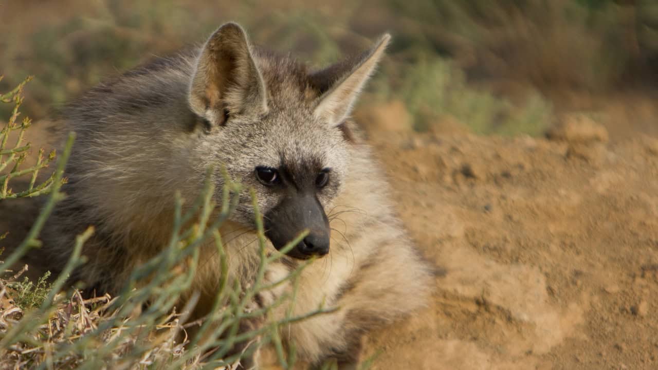 Bat-eared fox: This small fox is named after its large ears, which help it locate its prey by sound. It has gray-brown fur, a black face mask, and a bushy tail. It feeds mainly on termites, beetles, and other insects, but will also eat fruits and eggs. It is mostly nocturnal and lives in pairs or small groups.