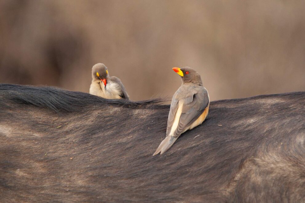 A quintessential site during a South African safari is a buffalo with a small flock of oxpeckers on its back and head. This small bird is recognised by its bright red bill and brown plumage and is found throughout southern Africa. Oxpeckers coexist with large mammals like buffaloes, rhinos, and giraffes, on which they perch to feed, consuming ticks, dead skin, and other parasites.