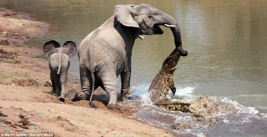 The mother elephant survived the attack along with her offspring, even after the baby elephant tripped over the croc as the pair ran away.