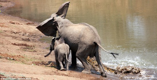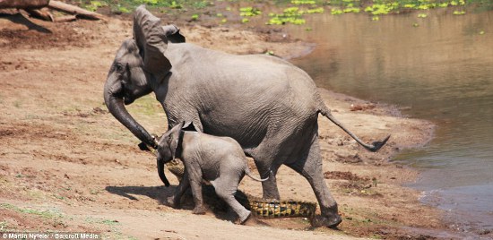 Scared and unable to help, the baby elephant hid behind its mum as the crocodile attacked.