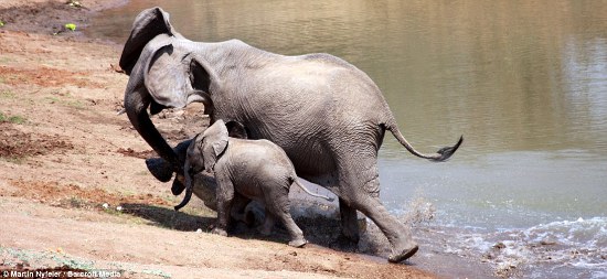 Free at last! Water gushed from the mum’s trunk as she finally managed to shake the croc off of her trunk. The baby momentarily tripped over the predator before the pair made it off safely.