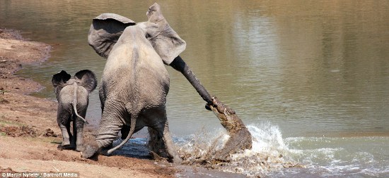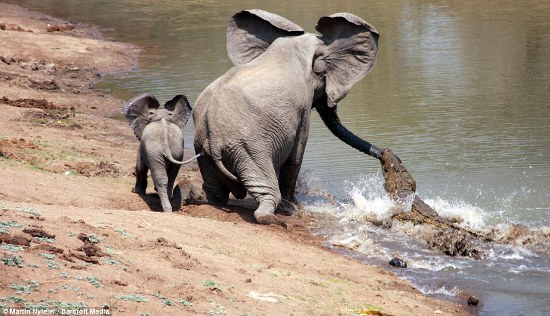 The mother elephant survived the attack along with her offspring, even after the baby elephant tripped over the croc as the pair ran away.