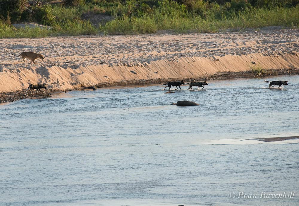Oblivious of the imminent danger, one by one the dogs started crossing the Sand River northwards. For them to drop into the water they had to jump off quite a steep sand bank. As soon as the last dog took the plunge the Charleston lioness was off at a rate of knots. She covered the sandy beached area in no time before pausing at the sand bank.