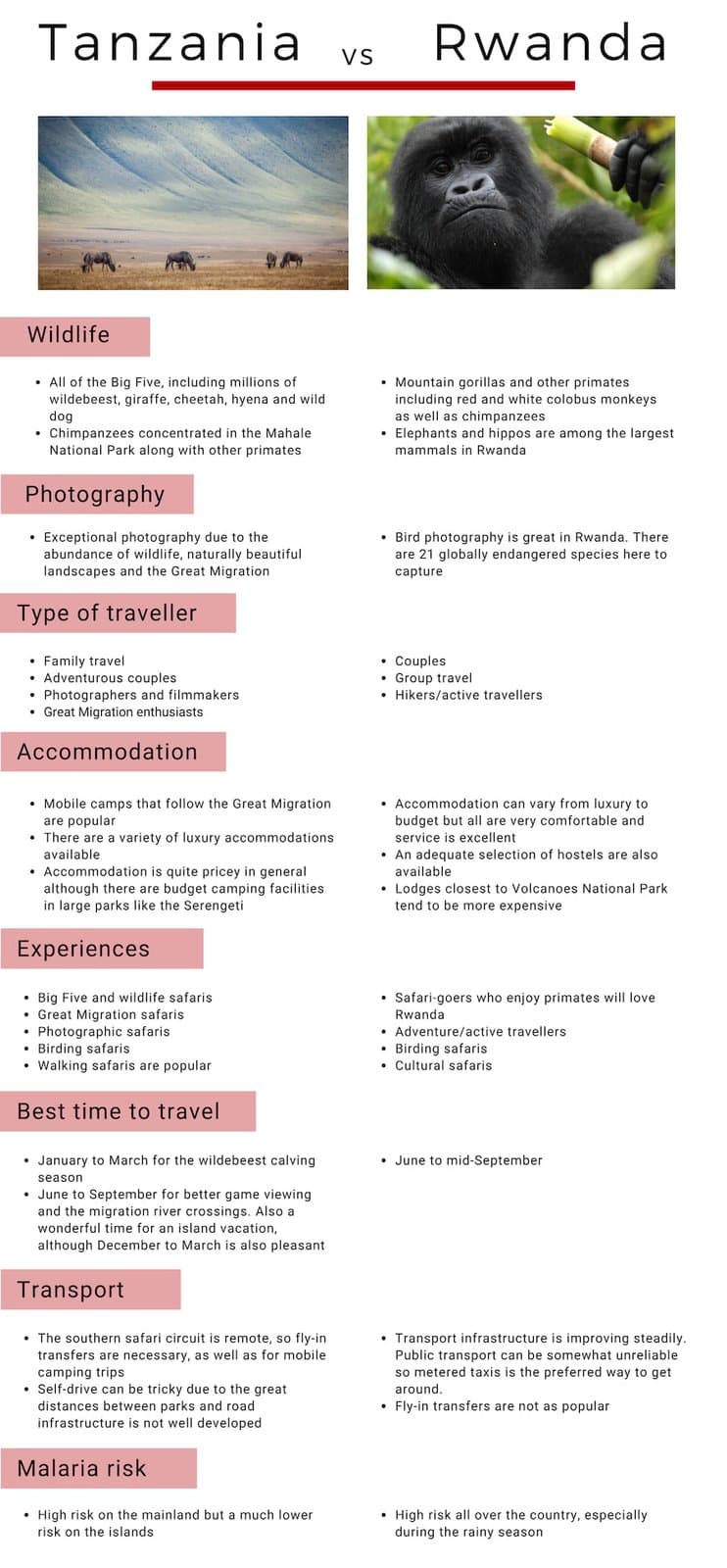 While Tanzania unquestionably has a far more extensive and diverse safari offering, it does not have mountain gorillas! With semi-habituated chimpanzees in the beautiful Nyungwe Forest and habituated mountain gorillas and golden monkeys in Volcanoes National Park, Rwanda trumps Tanzania when it comes to primate safaris.