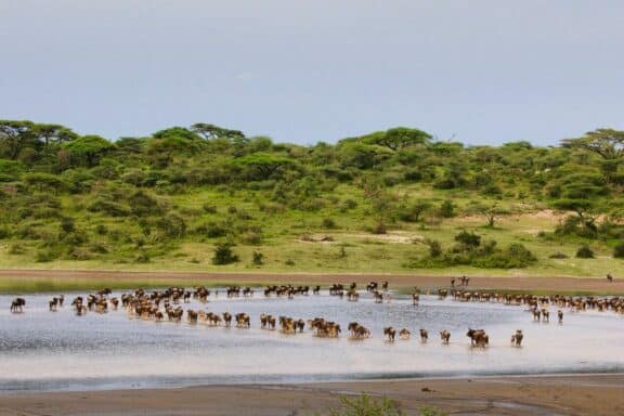 Wildebeest migrating over the Ndutu Lake – heading towards their grazing grounds