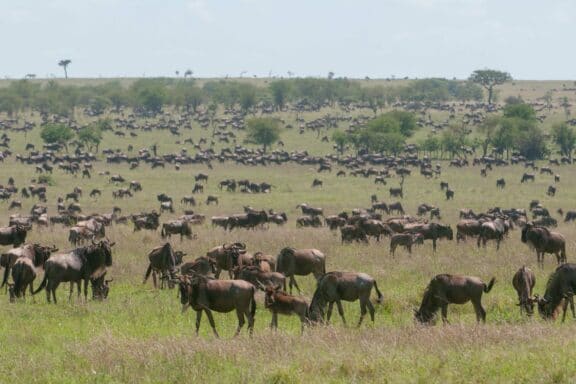 We have large numbers of wildebeest and zebra all round the lodge, spreading all the way through the woodland to where our shortcut road meets the Lobo road. From there, there are also huge numbers scattered all the way to Togoro Plains.