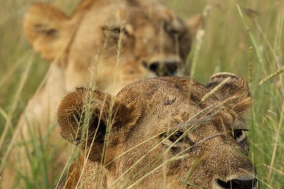 Two Butamtam Lionesses in watch of approaching wildebeest herds in the Grumeti Reserve.