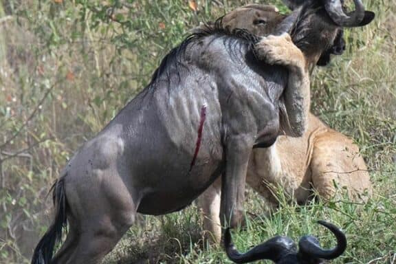 There are crocodiles in the river and other predators waiting elsewhere. Unbeknownst to Maralee Park, there was a lioness hiding in the tall grass waiting for the right moment to attack. It happened so fast that Maralee Park didn’t see it right away, but in the action happened in front of them – a lioness attacked one of the wildebeest. After a few minutes, Maralee Park’s ranger moved the vehicle a little closer. The lioness actually killed at least 2, maybe 3 wildebeest while they were there.