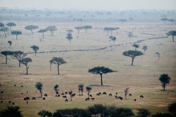 Large herds of the wildebeest and zebra scattered around the Mbalageti Lodge