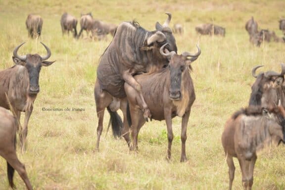 Great sightings of wildebeest bulls on testosterone, running around inspecting and breeding with the wildebeest females – part of the ritual is locking horns and fight before passing their DNA.