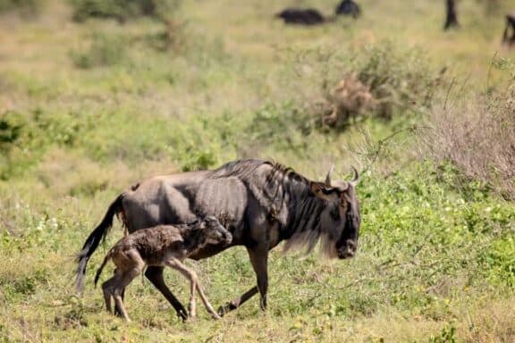 Thunderstorms are becoming common as the long rains are starting. It is thought that the wildebeest follow the lightning and thunderstorms in search of water. They continue eating as they move, and are scattered all across the plains, generally west of Ndutu. One day they will be all around and the next they could all have moved off, like a single entity. As the rains start to fall, the wildebeest canter off towards the storms, searching for water, Sometimes after a day or two, they return if the promise of water did not materialise.
