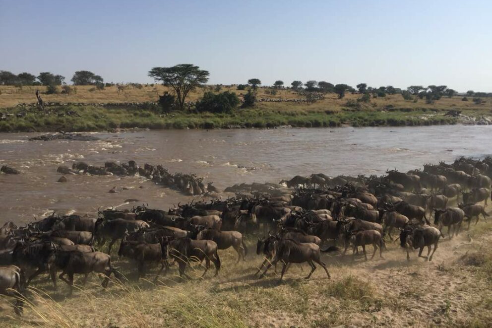 Safari guide, Ian Kiwelu captured a large herd of the migration crossing the Mara River.