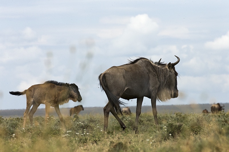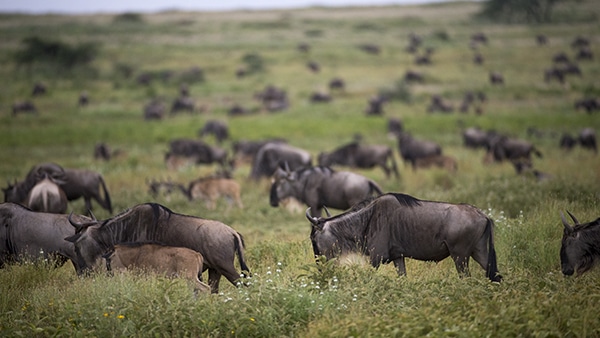 Mixed herds of wildebeest, zebra and eland are spread across the plains south of Ndutu, with sporadic storms and showers greening up the grass and keeping the pans filled with water.