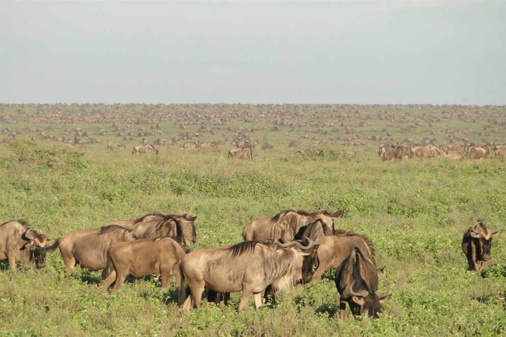 The area is full of wildebeest. But spread out. Last night from meadow through binos looking out at Triangle and up to Lemuta / Gol – wall to wall wildies.
