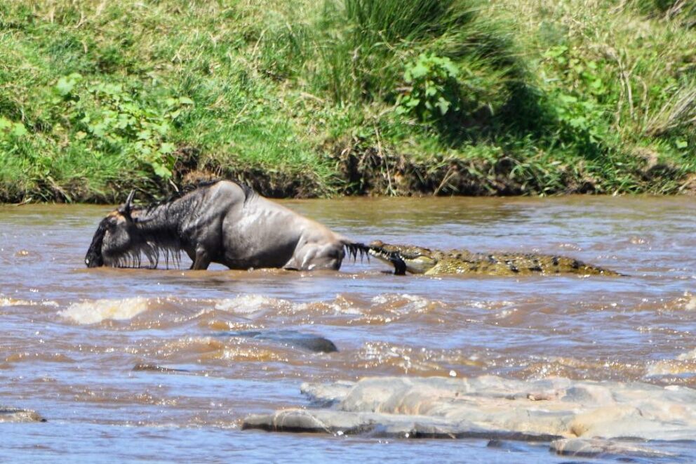 Close call! Despite being caught by the tail, this lucky wildebeest managed to escape and successfully cross the Mara River.