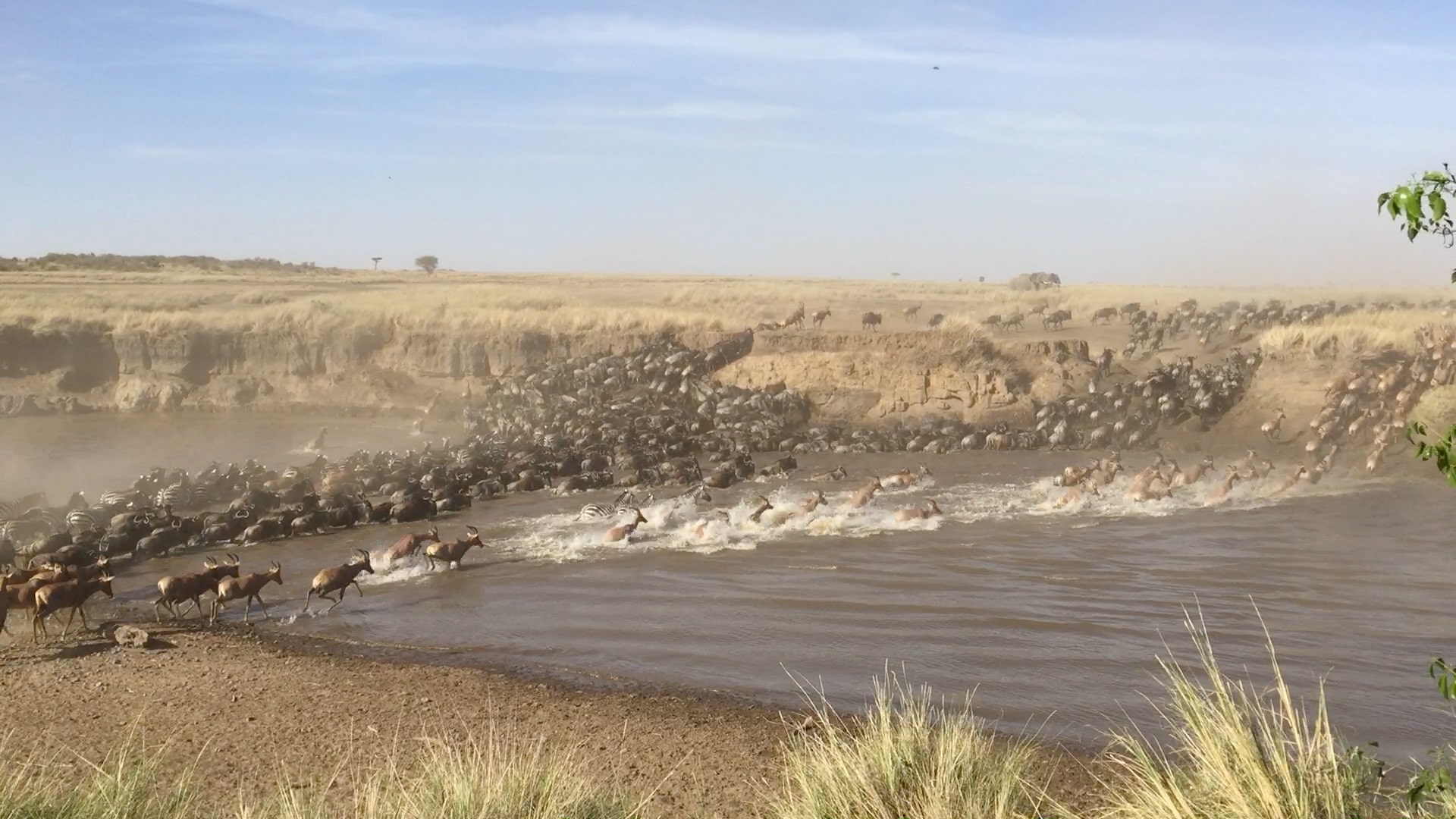 There was a good crossing lasting 15 minutes at the main crossing below Serena yesterday morning at 8.30am. Wildebeest, Zebra and Topi all crossed at once with Topi leading the crossing all going south west. There was an estimated 2,000 animals that crossed here. Photos courtesy of Kevin Twiddy.