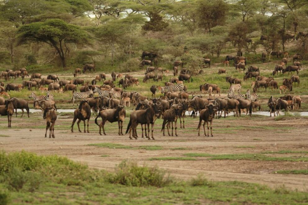 A big number of the wildebeest and zebra were seen migrating near the small marsh in the Ndutu area.