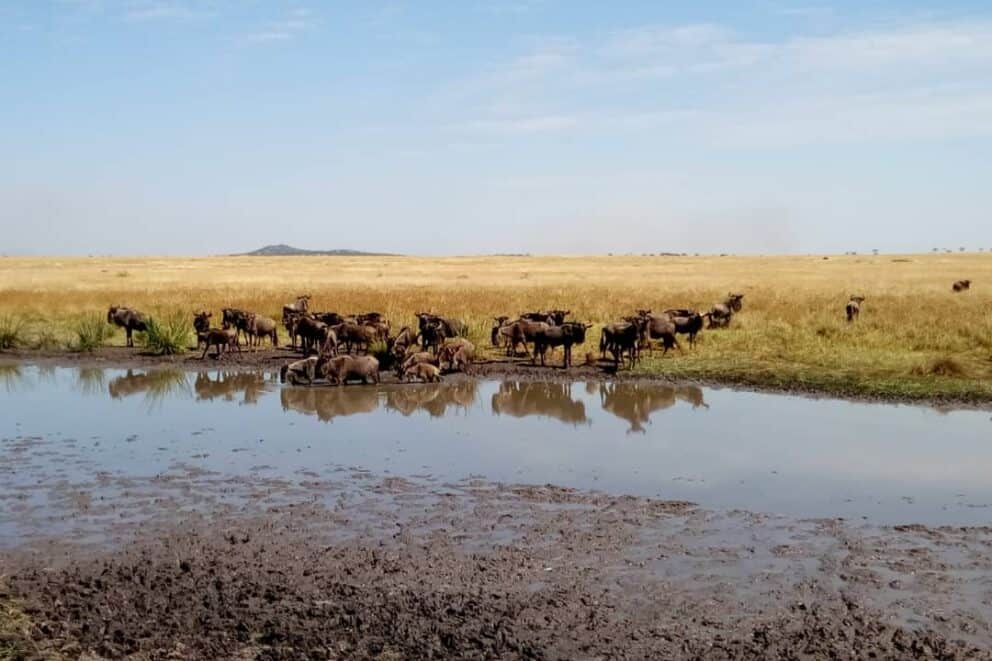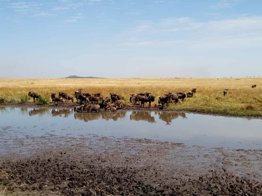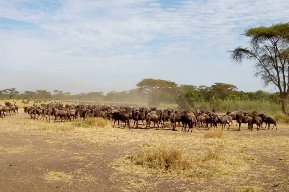 A large group of the wildebeest migration was captured one kilometre before the Nyasiroli, Grumeti bridge to the border of the Grumeti Reserve.