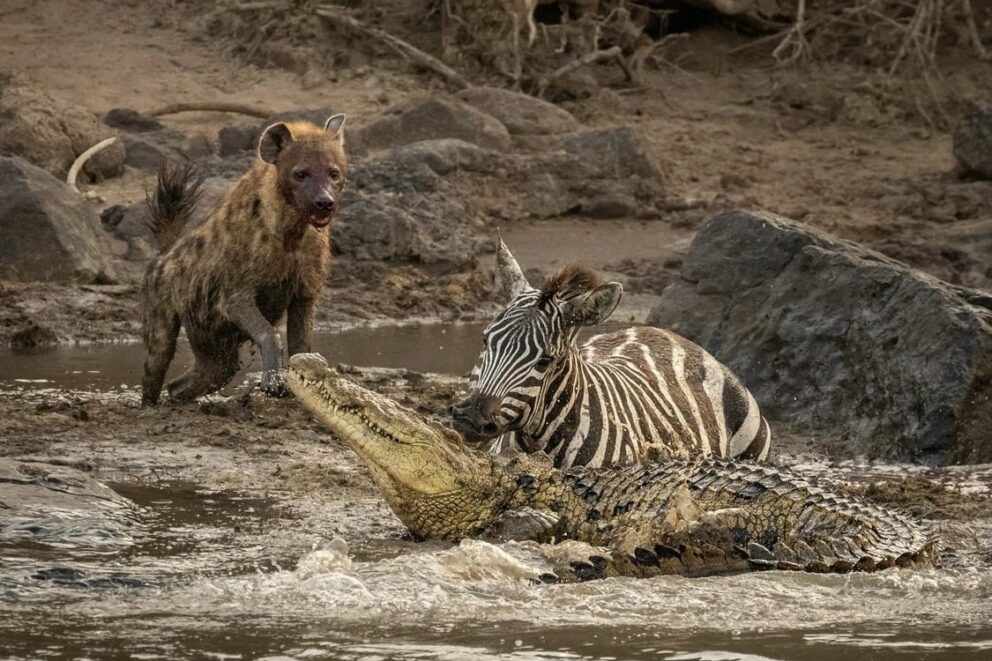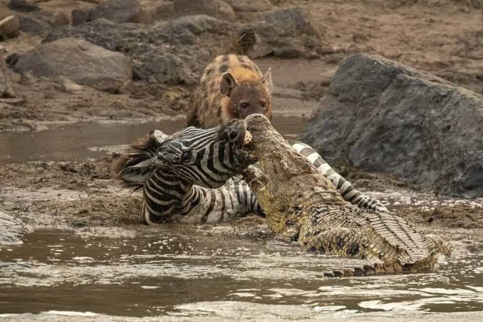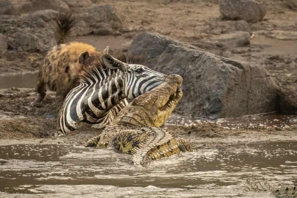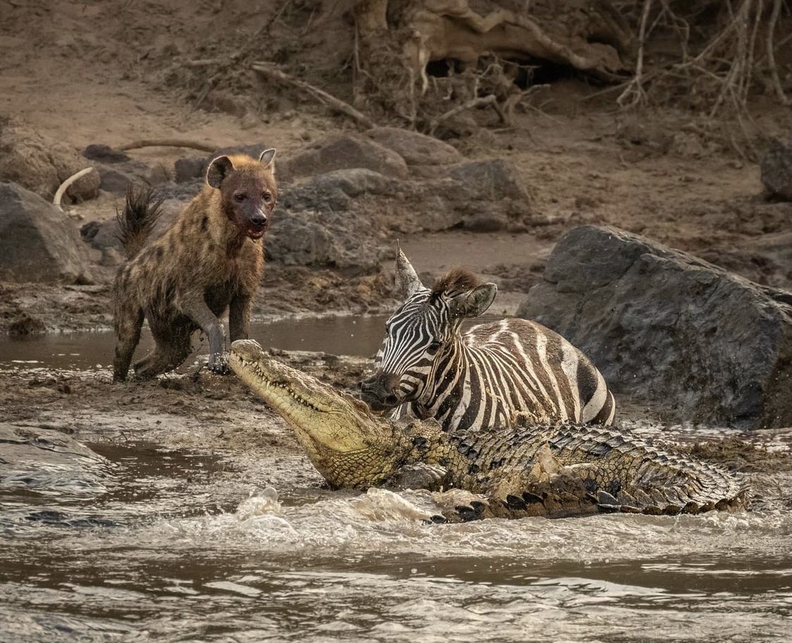 In the Masai Mara, action has been witnessed at the key crossing point! This Zebra had previously been attacked while crossing the river, yet it managed to pass with an open belly and intestines hanging out on the other side. The Hyena ultimately joined the party and began attacking, but the crocodiles reappeared and reclaimed their prey. Amazing action photos!